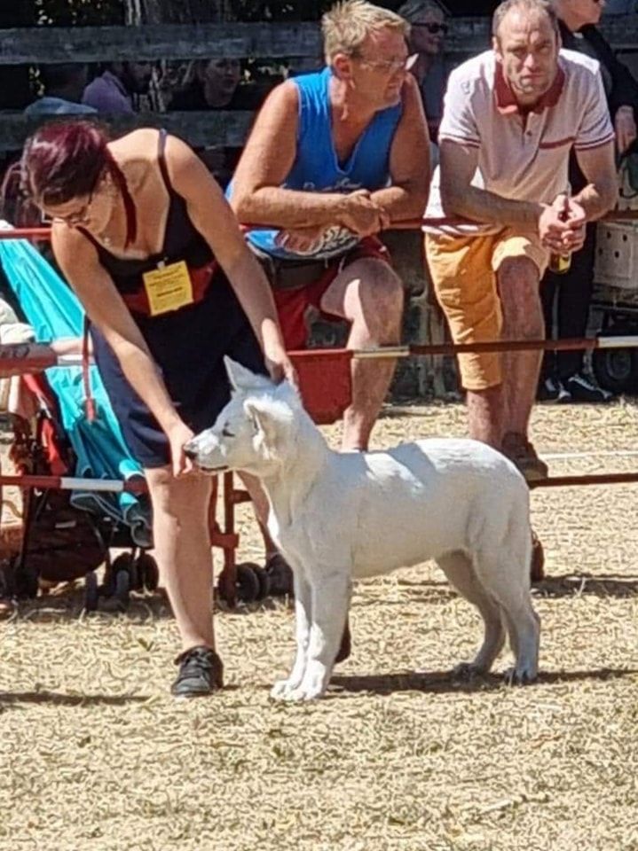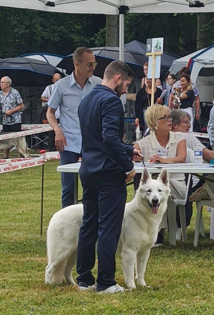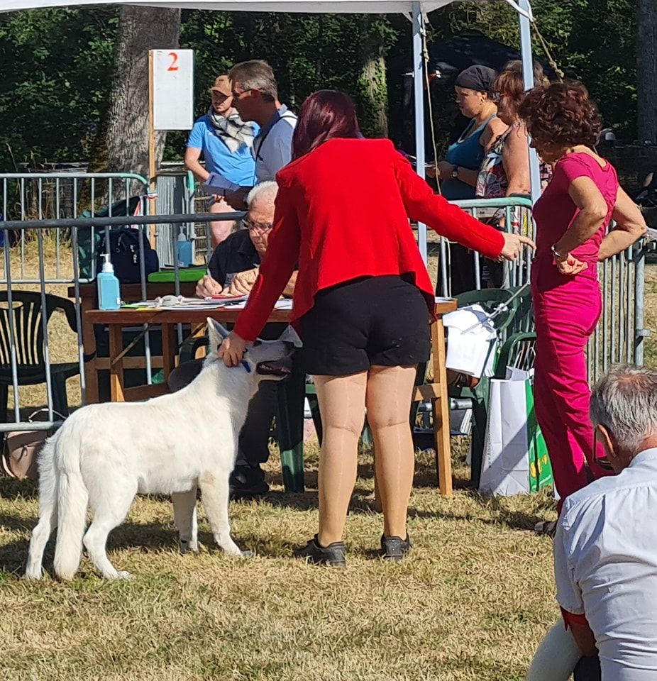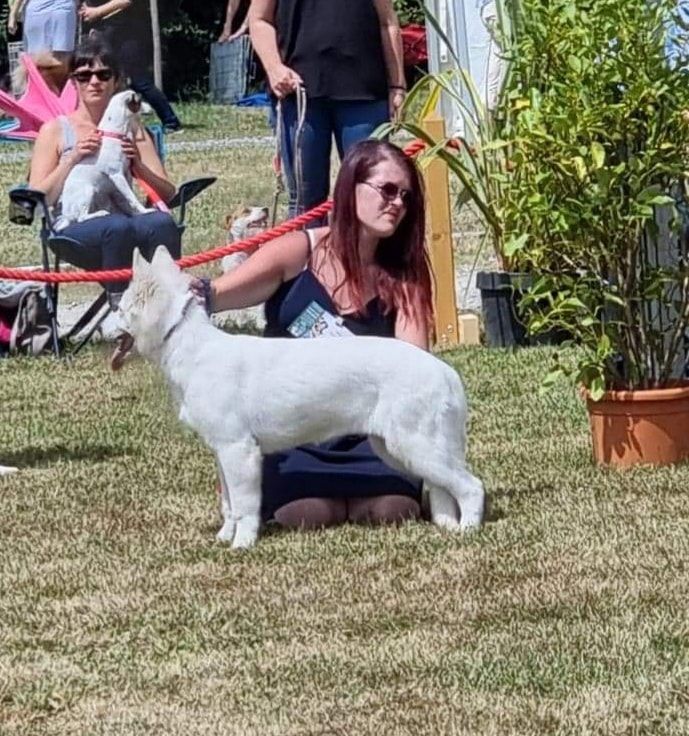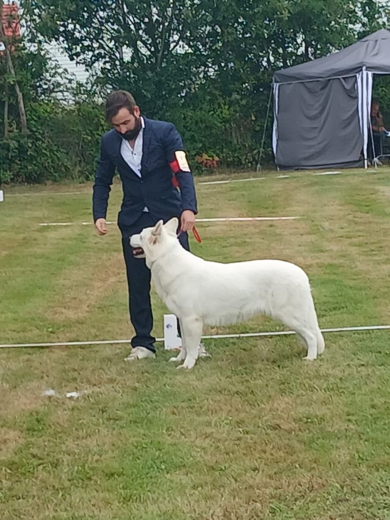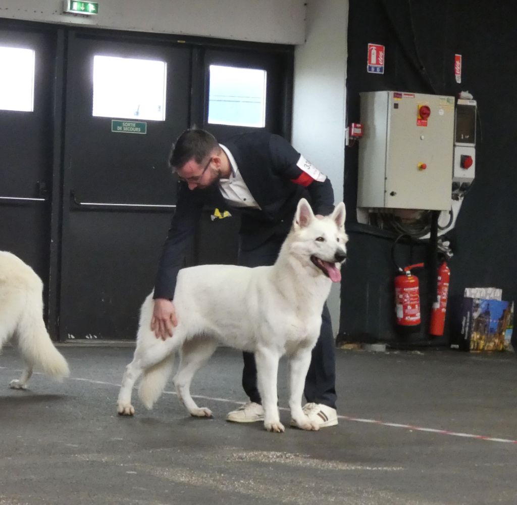 DCC, Très bonne tête, Excellente pigmentation, Oeil de bonne forme un peu clair, Bon port d'oreille, Excellente ossature, Très bon pied et poils, Corps bien proportionné, Ligne de dos un peu souple, Très bonne épaule, Excellent arrière main