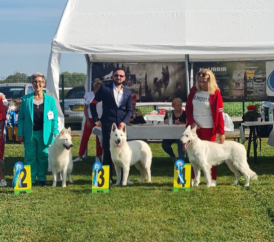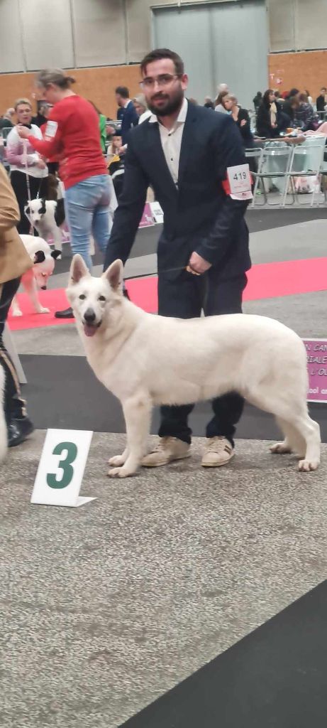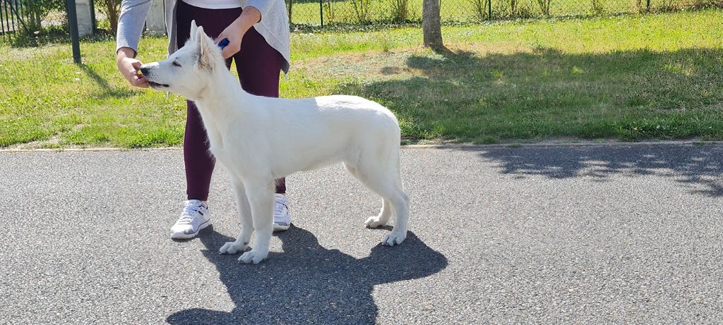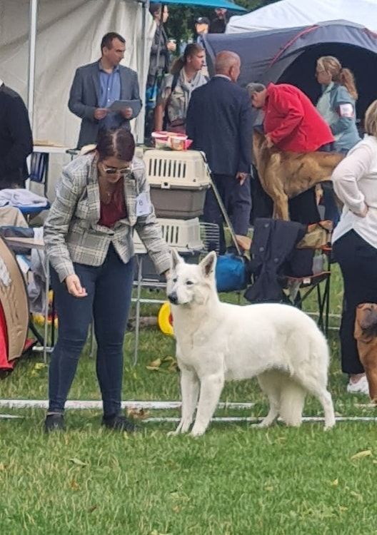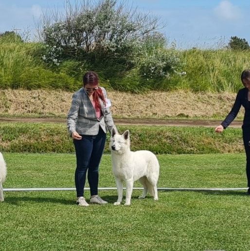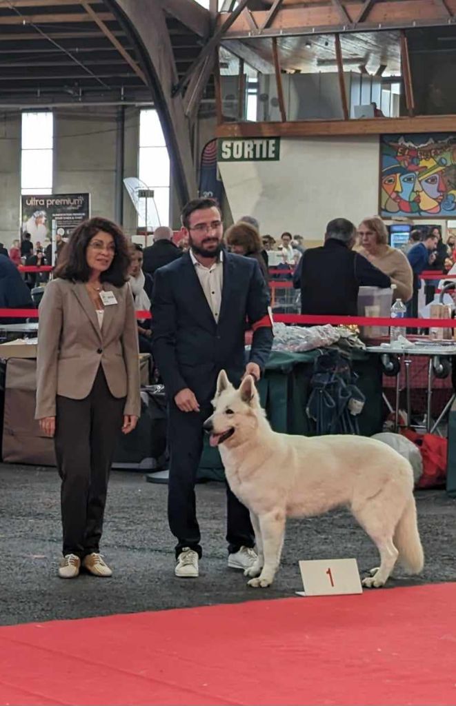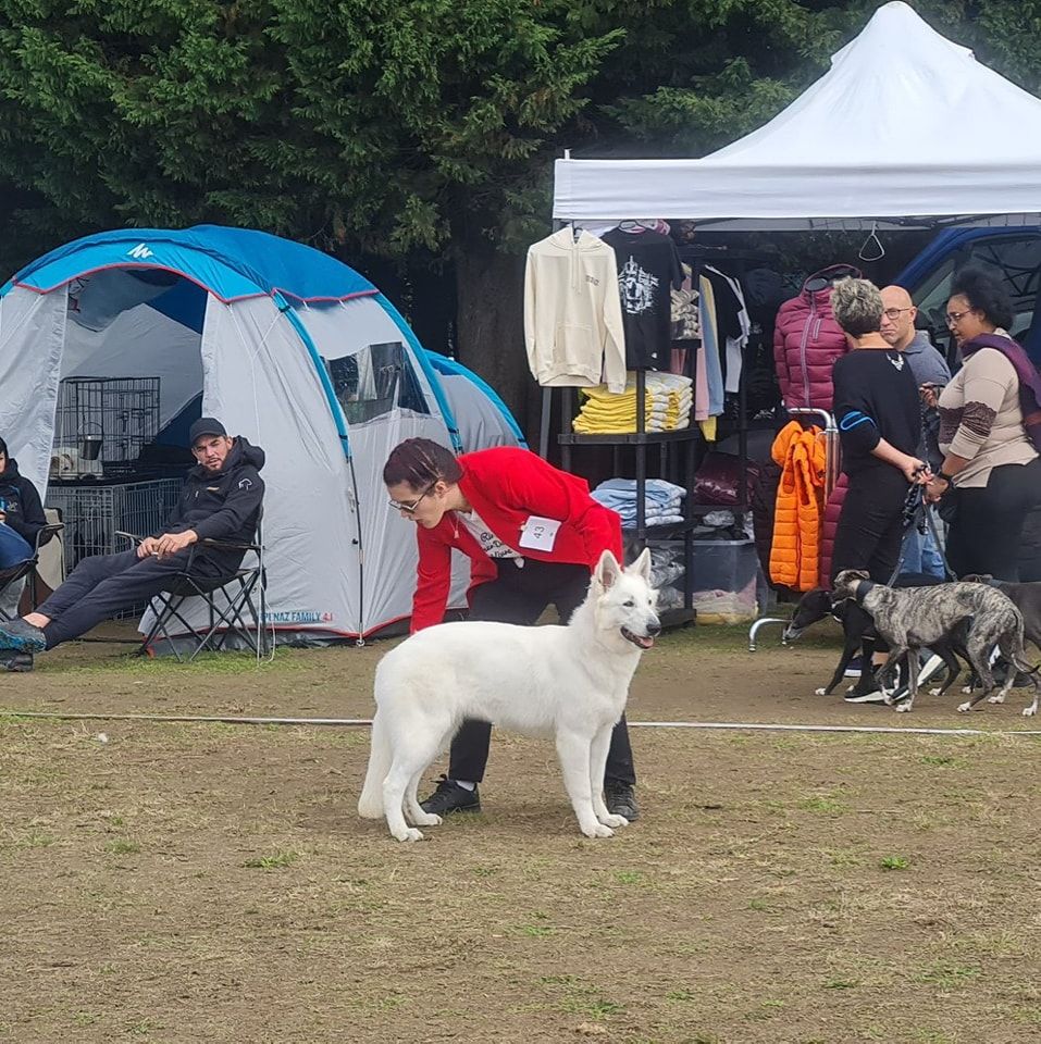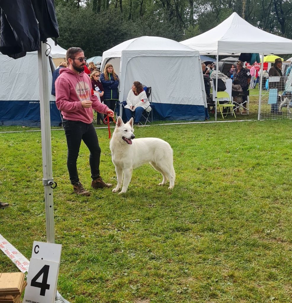 DCC, Très bonne tête, Excellente pigmentation, Oeil de bonne forme un peu clair, Bon port d'oreille, Excellente ossature, Très bon pied et poils, Corps bien proportionné, Ligne de dos un peu souple, Très bonne épaule, Excellent arrière main