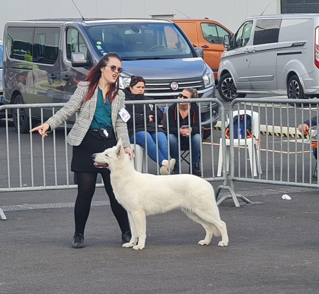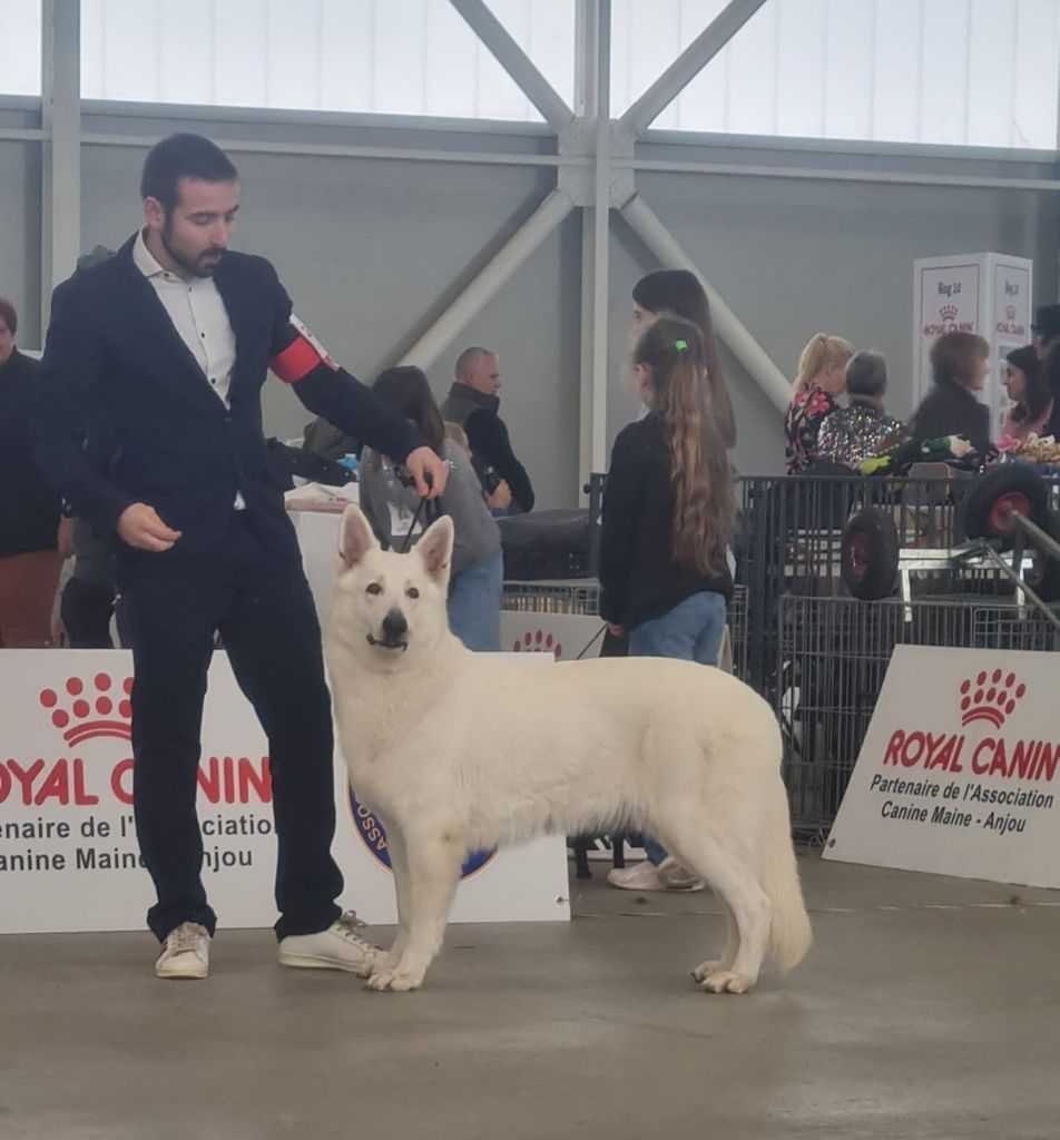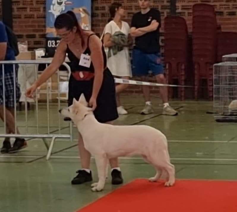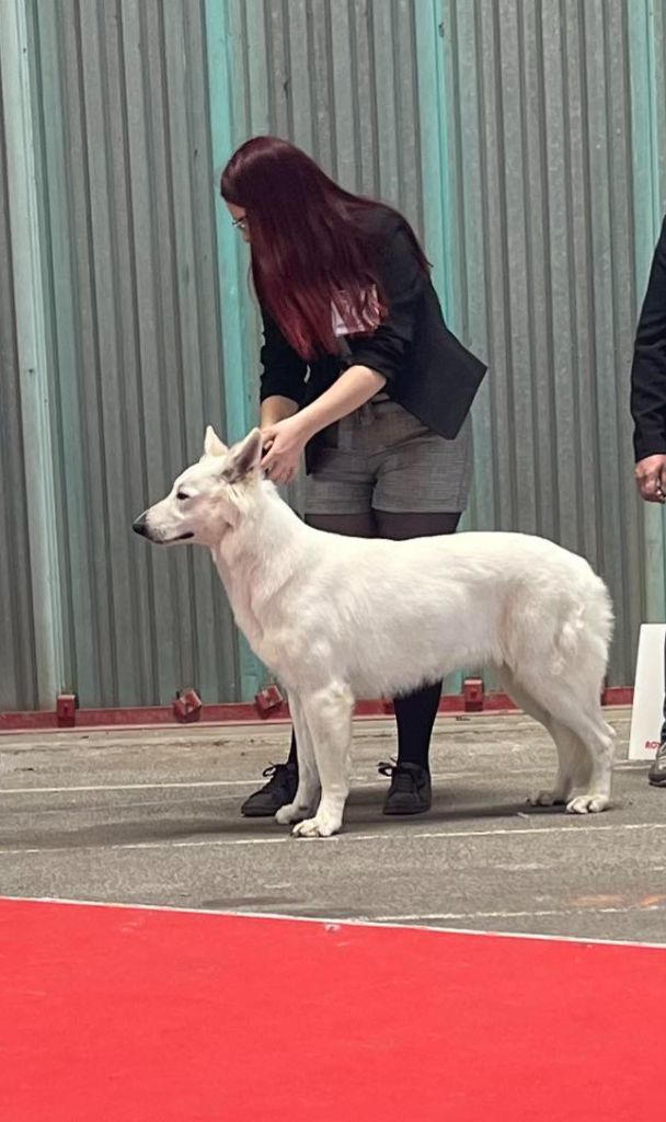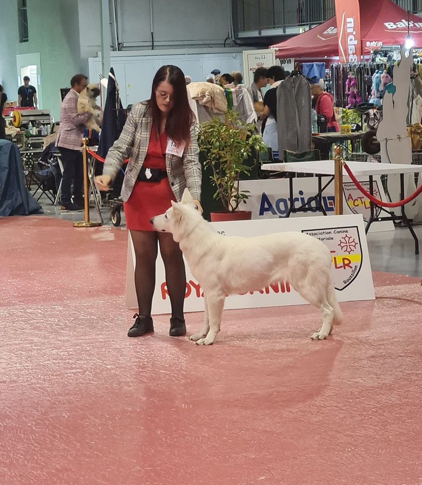 6 mois, DCC, Excellente expression, Bien présente sur le ring, Très féminine, Stop est peu prononcé mais visible, Truffe noire, Lèvres jointives, Oeil bien oblique en amande, Bonne couleur, Oreille extrêmement bien dresséesCorp: Rapport 12/10e respectée, Ligne de dos bien horizontale, Excellente poitrine et poitrail, Excellent ossature et pied, Laxité ligamentaire à revoir à l'âge adulte, Excellent port de queue, Bonne prise de terrain, Excellent caractère et présentation