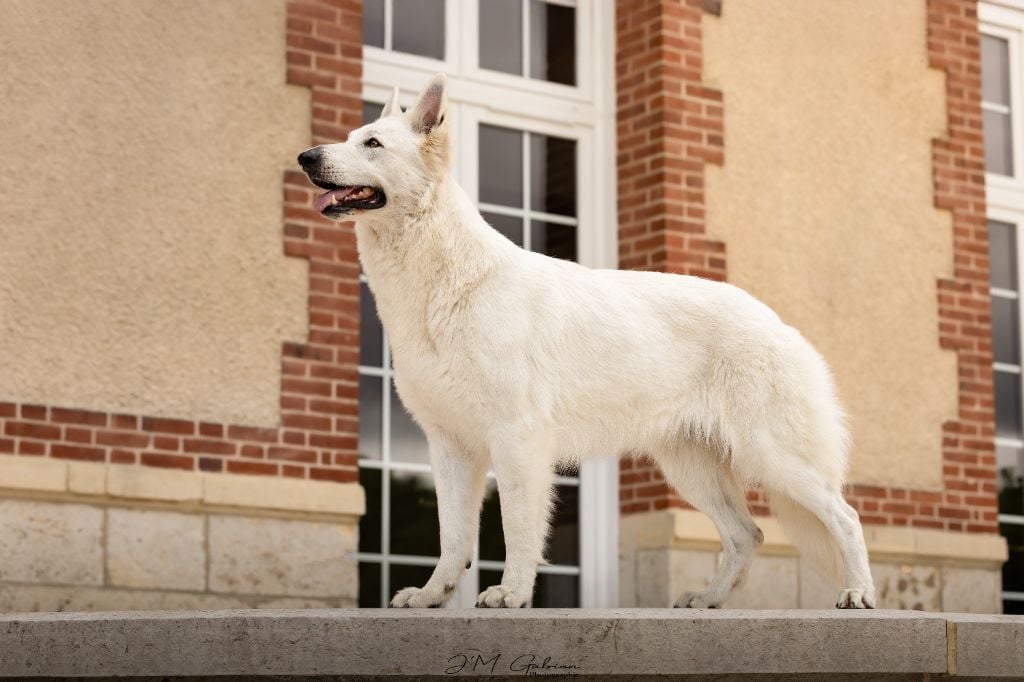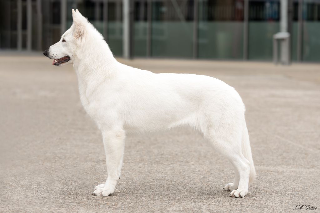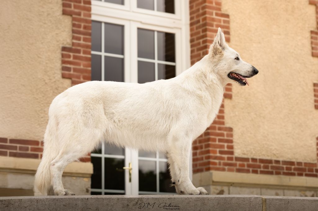 Chienne puissante qui reste féminine, Jolie tête, Excellente oreille, Belle pigmentation, Encolure très puissance, Belle ossature, Excellente poitrine, Ligne de dos robustre, Belle arrière main, Bon fouet et de bonne longueur, Excellente texture de poils, Mouvement efficace