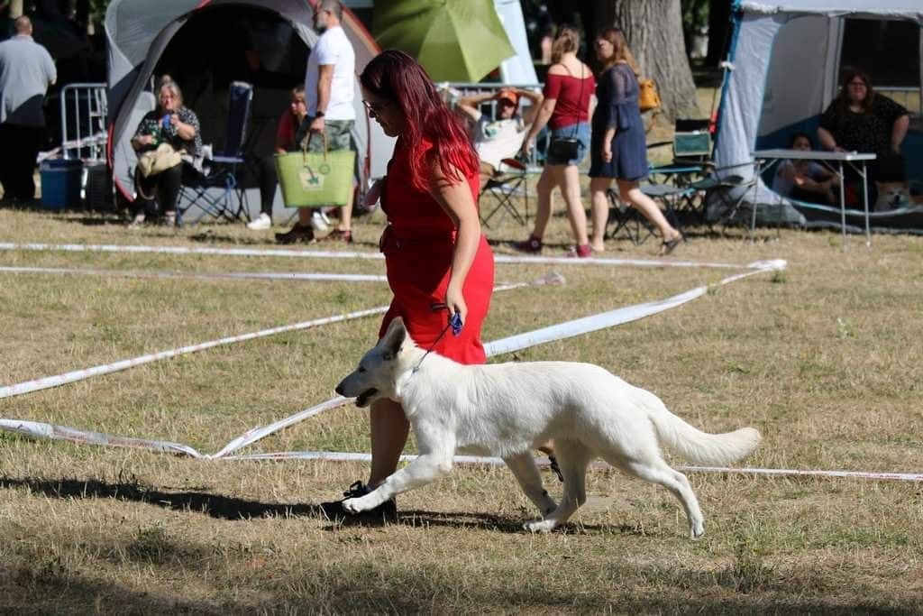 Jeune sujet de bonne proportion, Excellent aplombs et angulation, Bonne tête, Oeil correct, Oreille légèrement divergente, Très bon dessous de poitrine et croupe, Excellent fouet au statique, Bon mouvement de profil, Excellent caractère