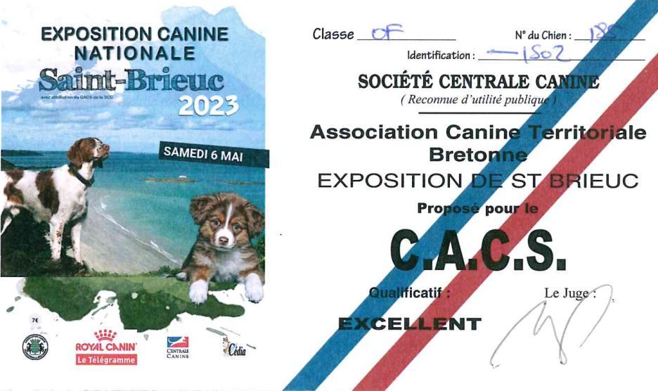 Prognathisme normalFéminine, bien anguléePieds de chatBelle poitrine + poitrailExcellent dessusEncolure nobleJolie têteExcellent crâne et stopMuseau suffisamment volumineuxOssature un peu plus forte est préférée dans la race et aurait donné une tête un peu plus volumineuseJolis mouvements, se déplace très bien
