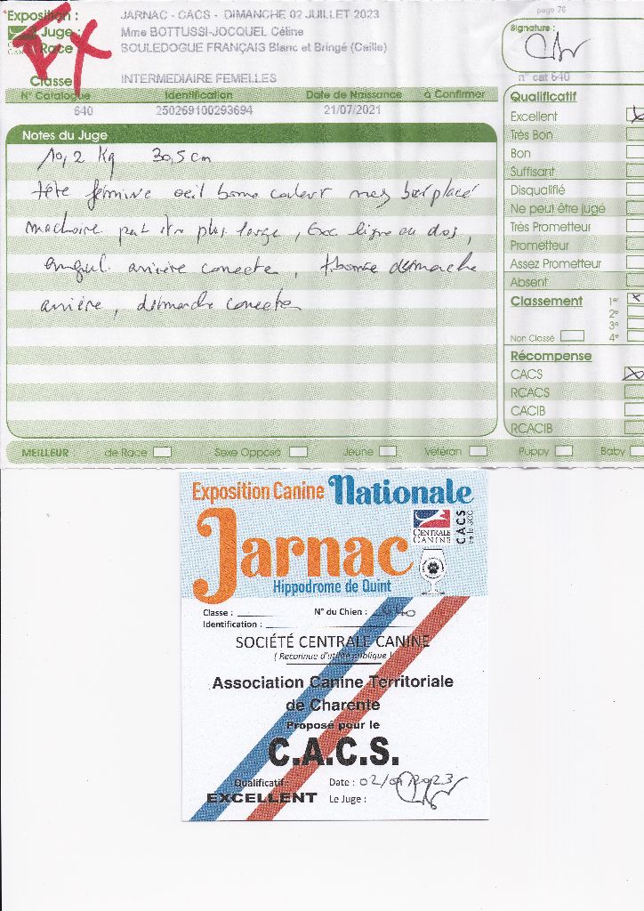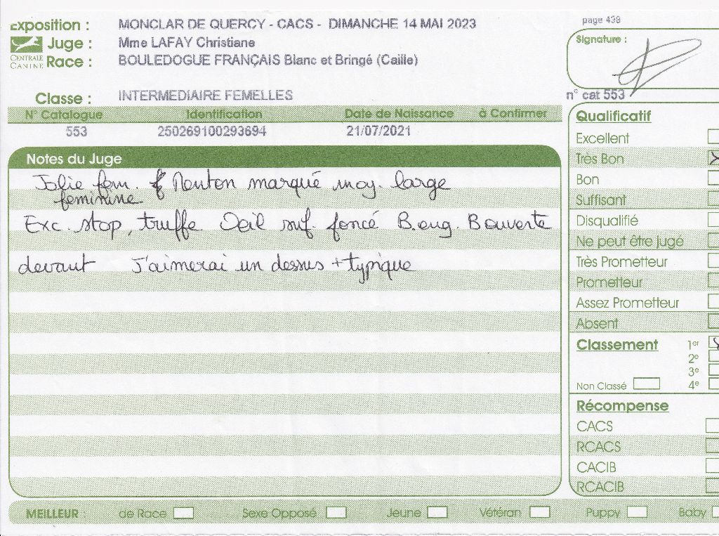 10 kg 30 cmSujet bien féminin.Très bonne ligne de dos, queue présente.Très bonnes proportions générales.Très bonne ossature, pieds légèrement écrasés.Très bonnes angulations et aplombs arrières.Tête bien féminine, narines correctes, la mandibule inférieure pourrait être plus large, denture correcte.Oreilles bien placées et bien portées.Bon mouvement typique de la race.