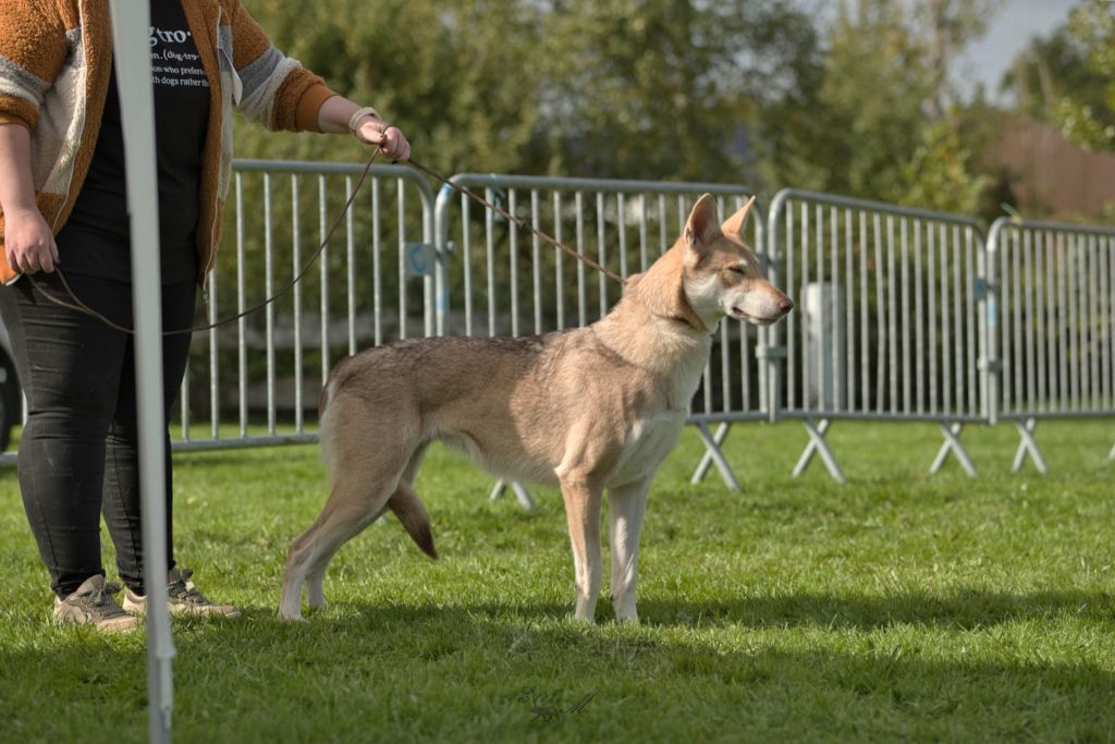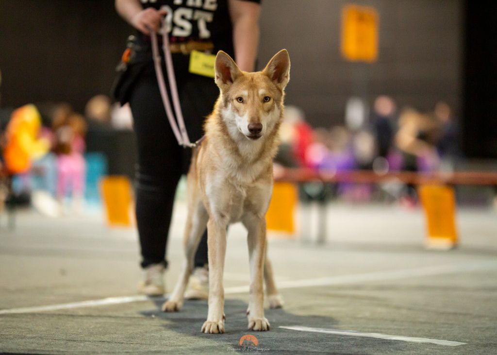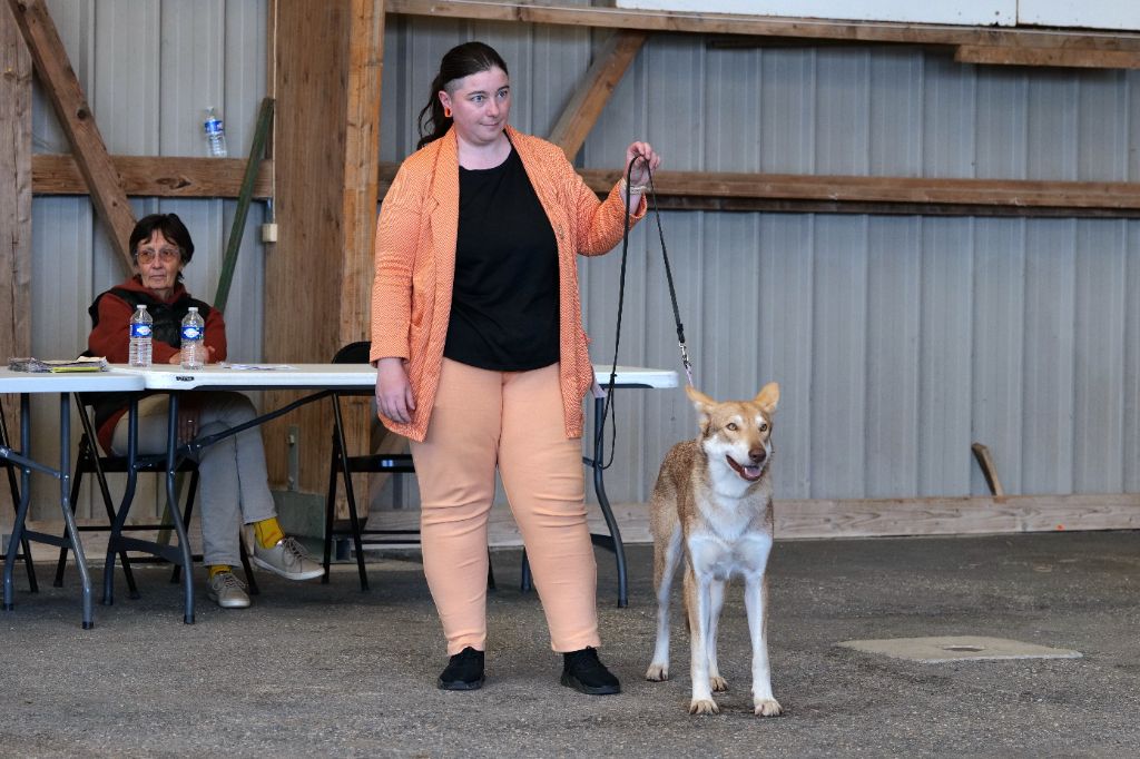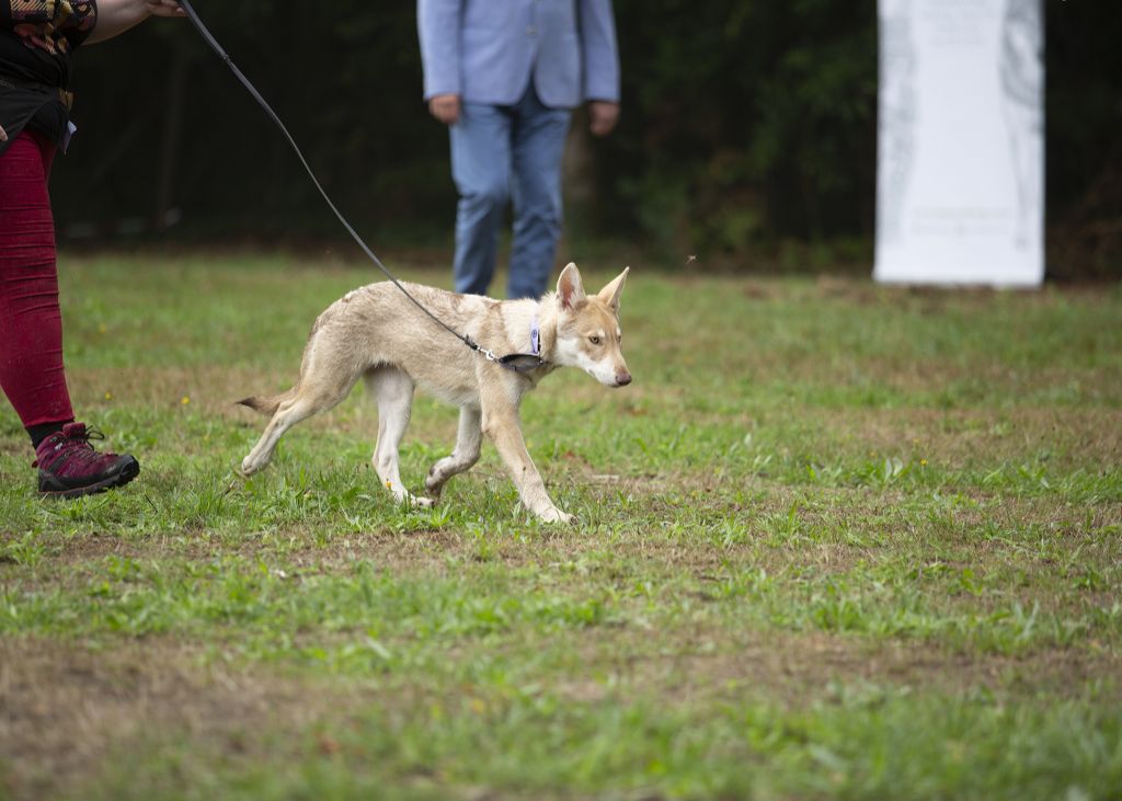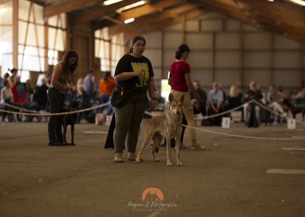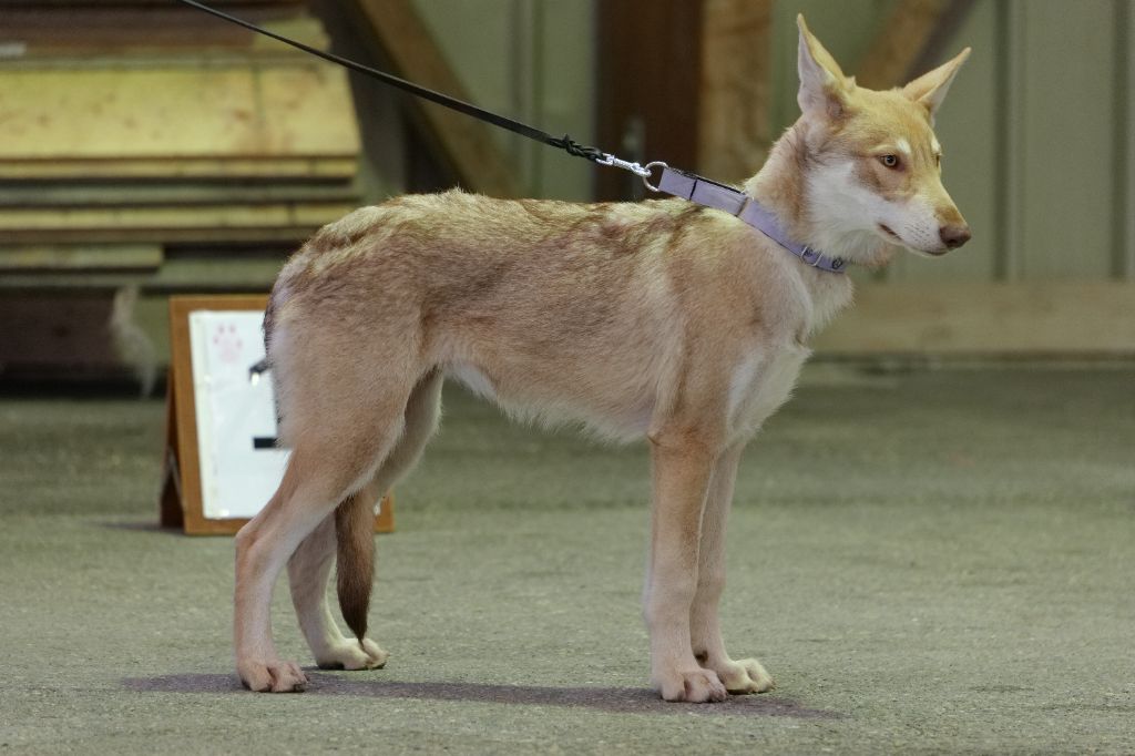 Jeune chienne de 14 mois, apparence générale typique de la race, tête féminine, forme et couleur des yeux correctes, oreille fine, légèrement étirée, se tient sur de longues pattes, angulation et ossature adéquates, en tout point semblable à un loup, pelage correct, comportement cohérent avec un Saarloos.