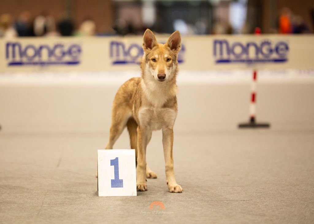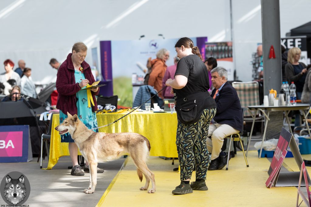 13 mois. Excellent type. Couleur correcte. En très bonne condition physique. Très bonne morphologie de la tête. Bon port d'oreilles. DCC. Bon cou. Oeil jaune conforme au standard qui lui donne une apparence de loup. Bonne ligne du dessus. Bonne implantation de la queue. La poitrine doit descendre encore avec l'âge. Aplombs avant et arrière équilibrés. Bonne conformité des doigts. Mouvement aérien. Réservée mais typique de la race. Très bien présentée.