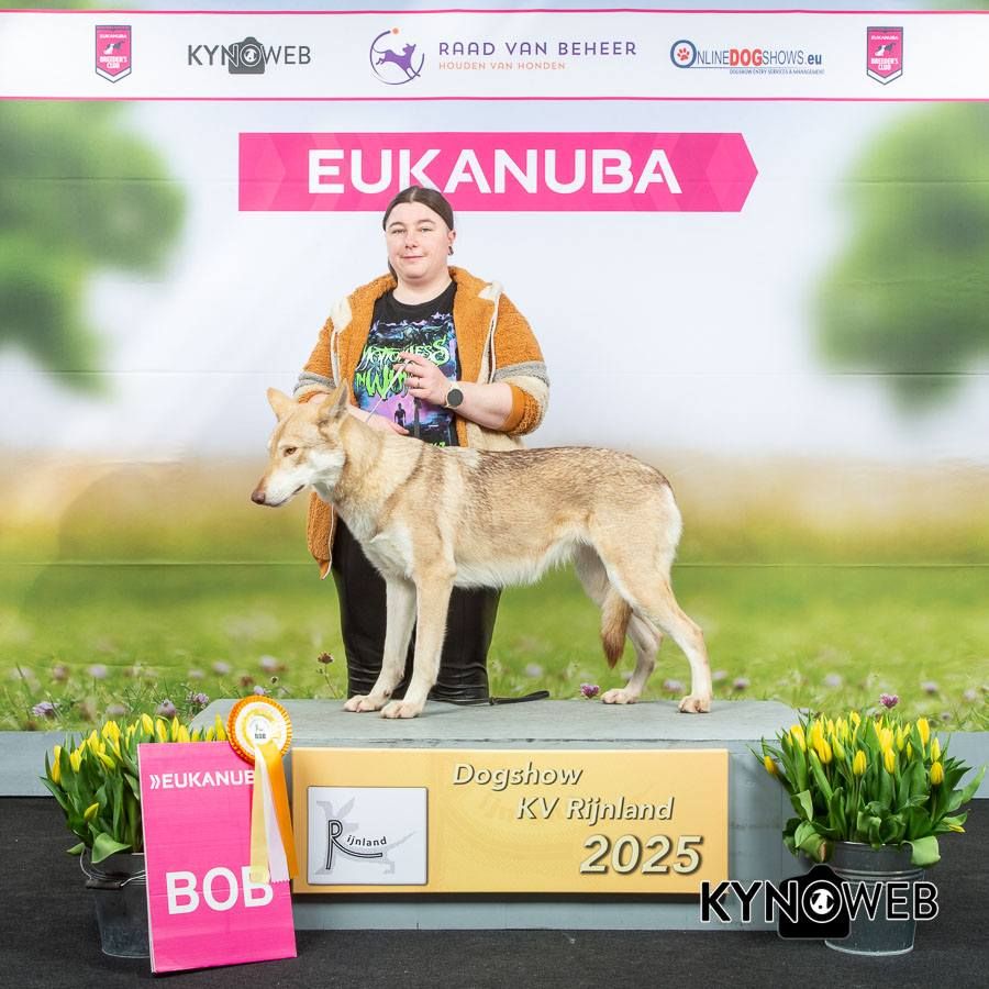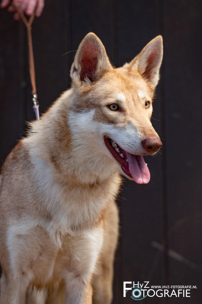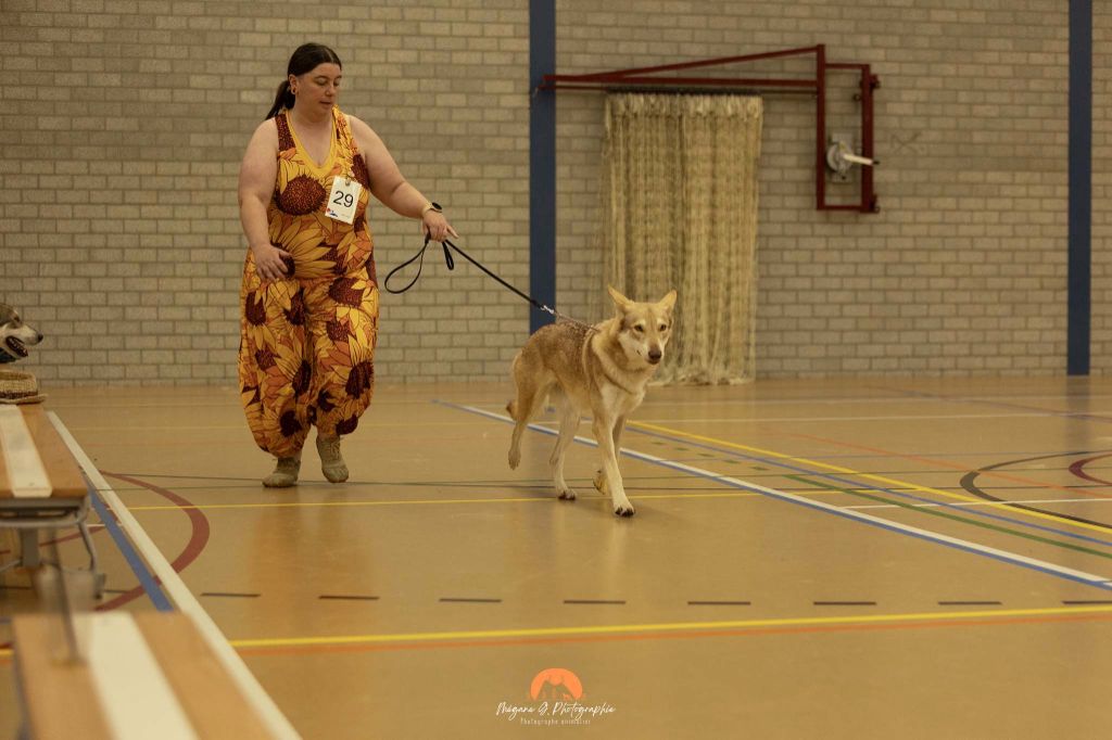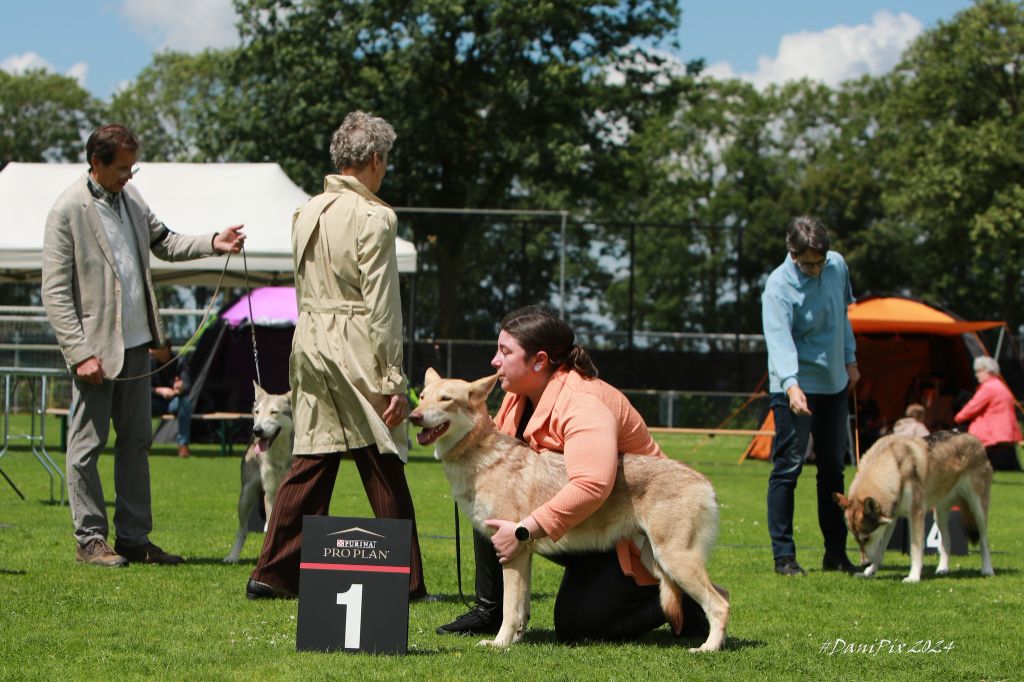 (Traduit du néerlandais par DeepL)2 ans. Chienne attrayante, fortement bâtie, en forme de loup, dans sa construction, son mouvement et son pelage.Plus longue que haute avec une ligne du dessus et une ligne du dessous fines. Belle ossature ovale. Pieds bien cambrés. Belle tête féminine en forme de coin. Oeil jaune en forme d'amande. L'oreillepourrait être un peu plus petite. Articulation en ciseaux. Le stop est net et léger. Bonne position du bassin et belle queue longue queue attachée bas. Se déplace facilement avec la démarche élastique typique de la race. A besoin de temps pour abaisser le cou et la tête, mais l'a montré brièvement. Vif et plein d'énergie. Beau pelage d'été.