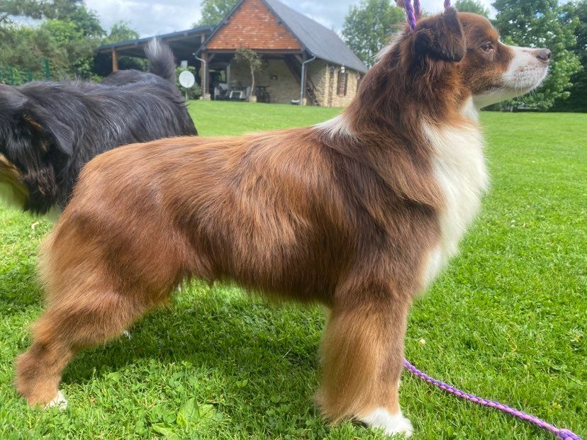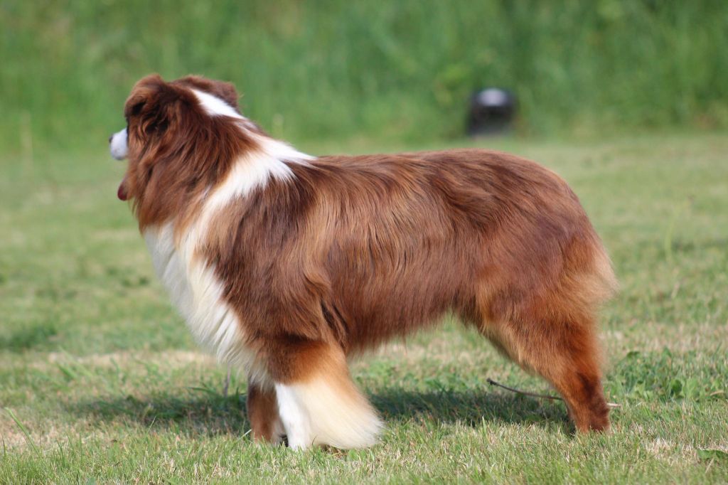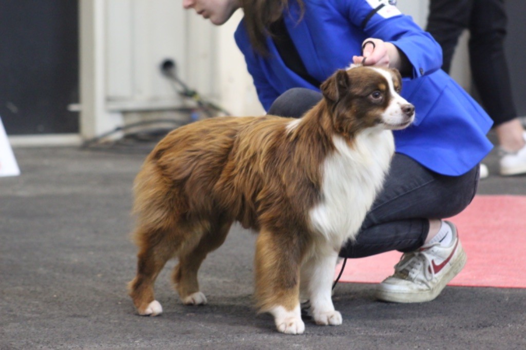 Rouge tricolore, petit modèle, 41cm, DCC, 2T, jolie expression,Tête : excellent rapport avec corps, excellent crâne 1/1, un peu bombé, stop un peu ? très présent, museau bien remplis, chanfrein un peu ? lignes bien parallèles, truffe bien pigmentée, bouche sèche, oreilles petitesCorps : excellent longueur + largeur, l'ensemble confère féminin, excellente encolure forte bien insérée dans l'épaule, bras bien placé, dos ferme, croupe excellente excellent poitrail poitrine, rein large et ferme, excellente ossature d'ensemble, excellents aplombs avant + arrière, excellents pieds Mouvement : excellent aller-retour, excellent allure bergère jeté très légèrement de l'arrièreExcellente fourrure, excellente présentation, excellent caractère