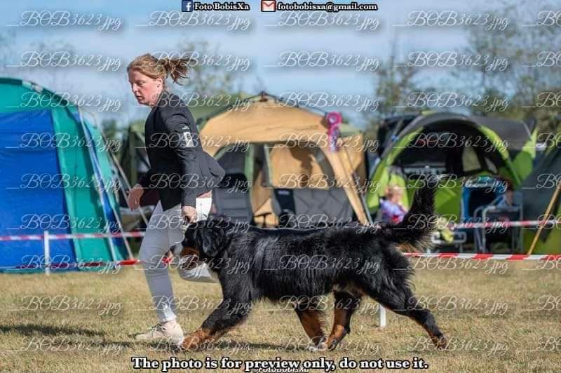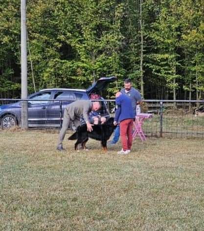Joli chien dans le type, de bonne taille, Exc proportion, Exc construction, Jolie tete, Arcade un peu marquées mais sans nuire a l'expression, Yeux de bonne couleur, Bonne forme de paupieres, Tres bonne denture et articulé, Exc ligne de dessus, Bonne longueur de fouet, Exc angulation avant et arriere, Ouvre legerement des coudes, Bon port de fouet, Exc couleurs, marquage et tempérament