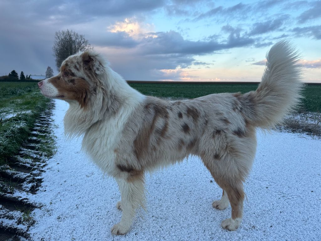 Mâle rouge merle, queue longue, toise 52 cm pour 22kg.