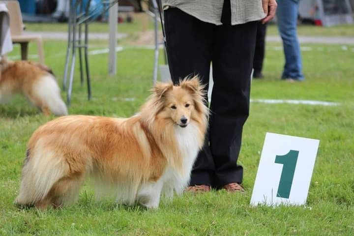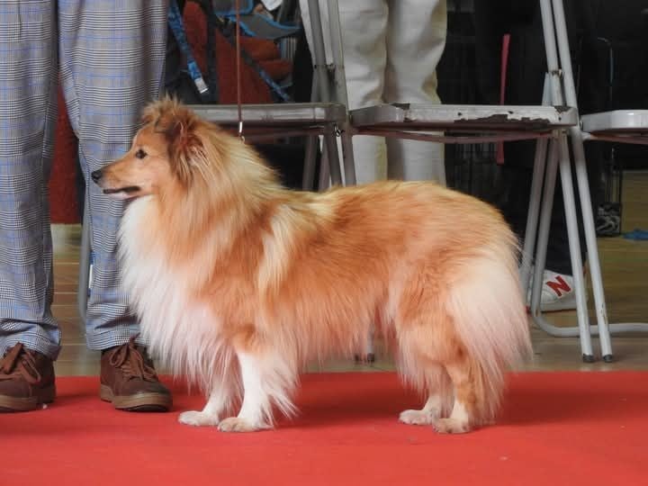 Exc format. Exc texture de poil. Exc long fouet. Angulation avant-arrière bien placée. Très belle expression avec un bon oeil foncé en amande. Sujet très féminin. DCC. Crâne plat. Exc // avant-arrière. Très joli mouvement de profil présentant bonnes amplitudes et belles allures bergères.