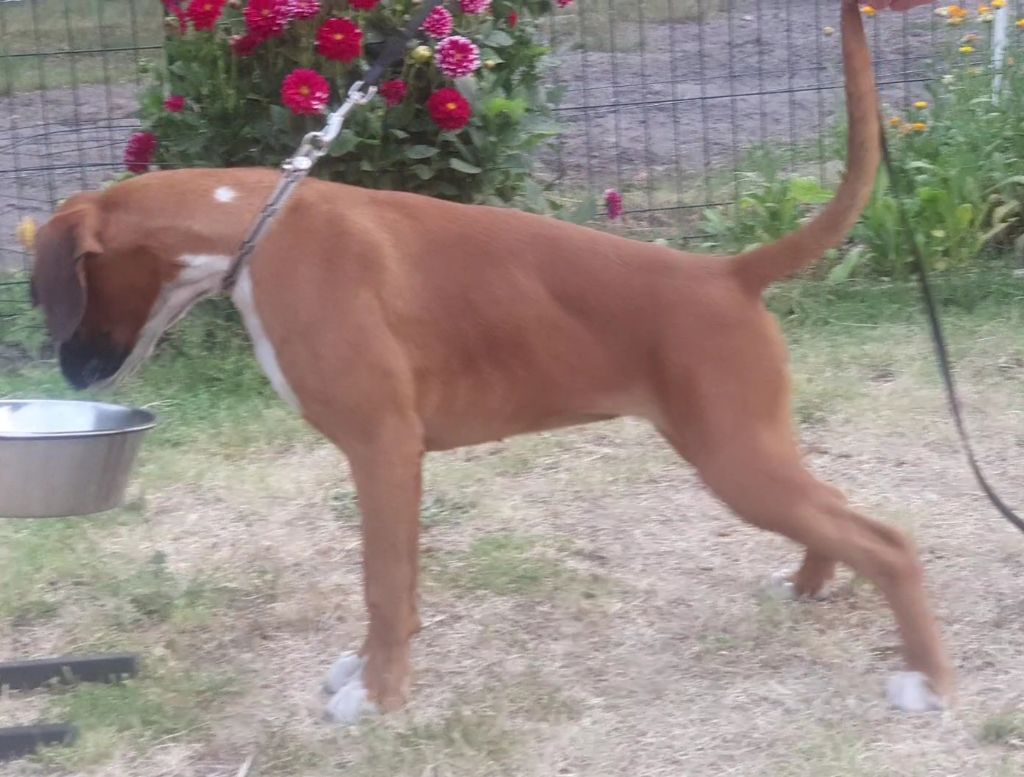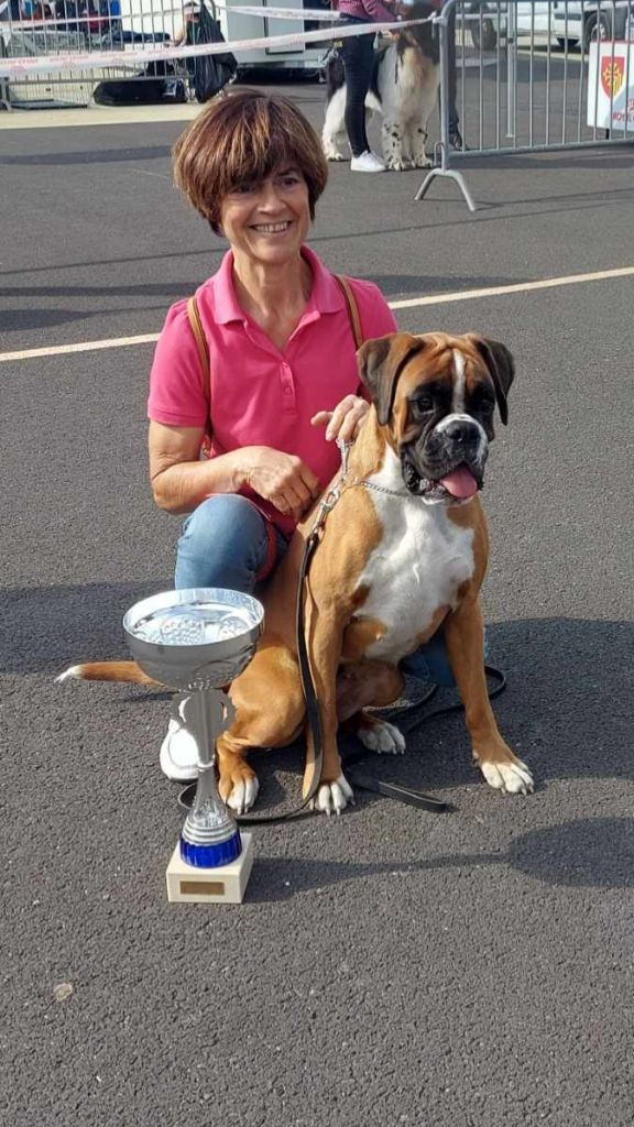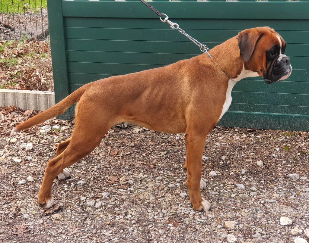 4 moisTrès élégante avec une jolie prestanceConstruction presque carréeTrès jolie tête typique avec expression boxer recherchéExcellent rapport crane/museau. Stop et menton marqués.Museau cubique et plein.Denture large, saine, droite et bien alignée Excellents yeux dans la forme et la couleur.Crane étroit, haut et secEncolure noble et féminine. Excellente ligne de dos pour son âge.Jolie ligne de dessous.Angulation AV et AR déjà parfaitement en place.Allure éléganteExcellente couverture de terrain aux alluresTrès Prometteur