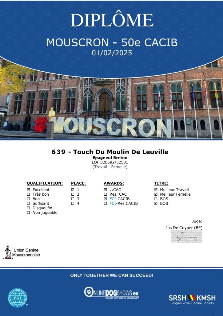 - 1er Excellent CACS + CACIB - meilleure de race de sexe opposé