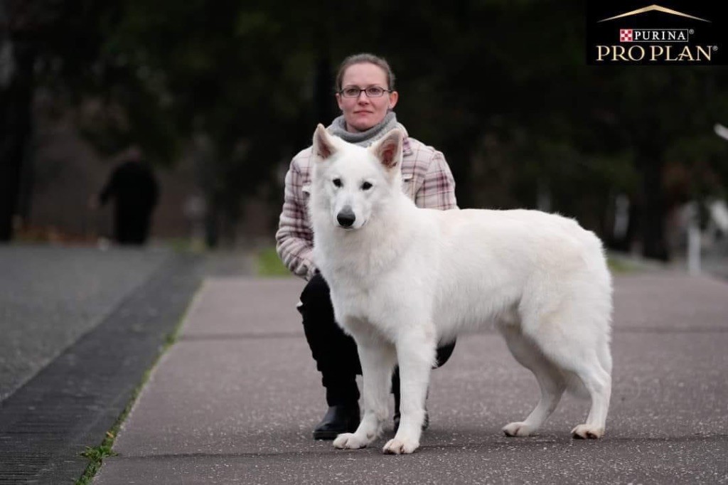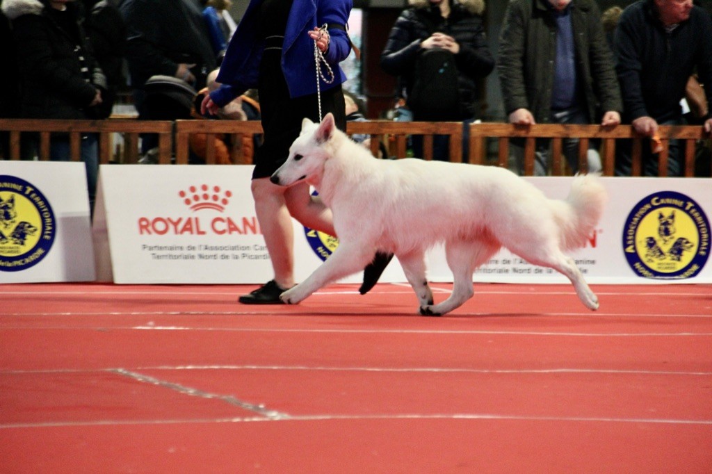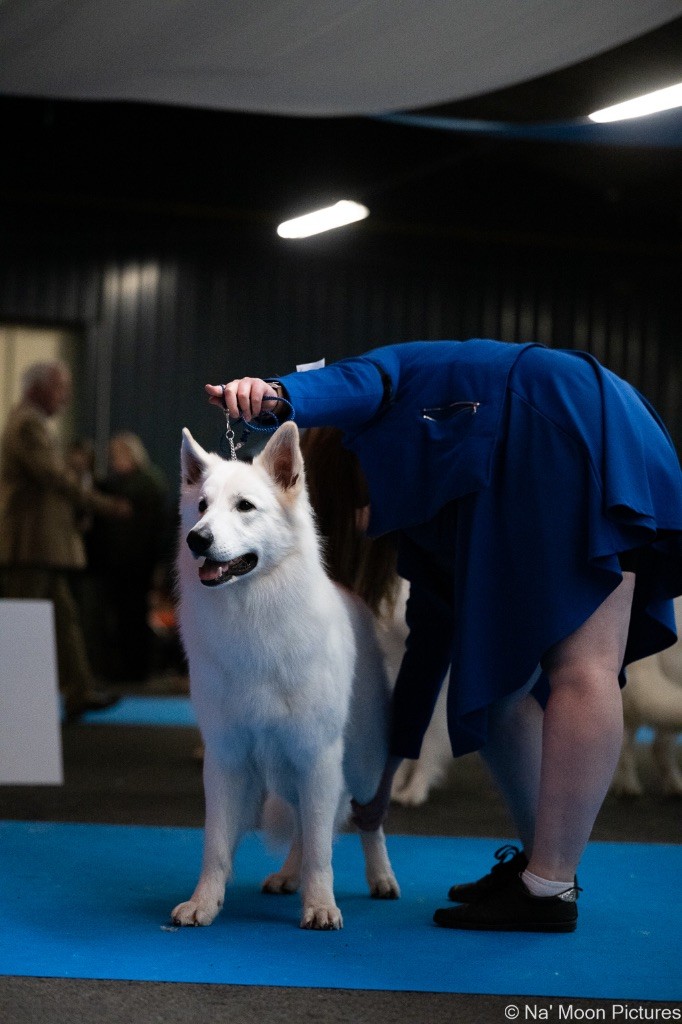 Bien blanc, DCC, 16 mois. Excellent dans son ensemble, rentre dans la classe, excellent crâne et stop. Oeil de bonne couleur et forme. Excellente ligne de dessus. Excellente ossature, bon aplombs, coprs et longueur. Allures typique bergere