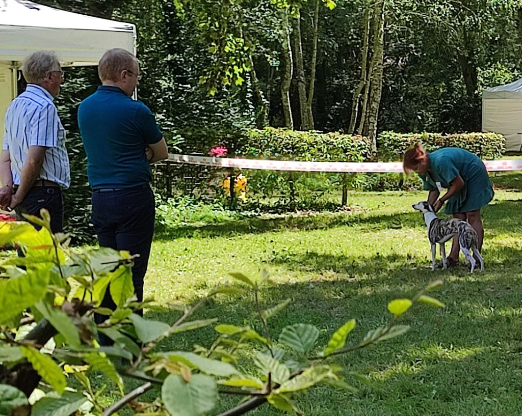 DCC. Joli sujet. Féminine. Bonne tête. Bonnes oreilles. TB encolure. Exc ligne de dessus, croupe,cuisses et jarrets. TB angulations av. Poitrine correcte. Exc pieds, fouet. Démarche correcte. Mouvement a travailler.