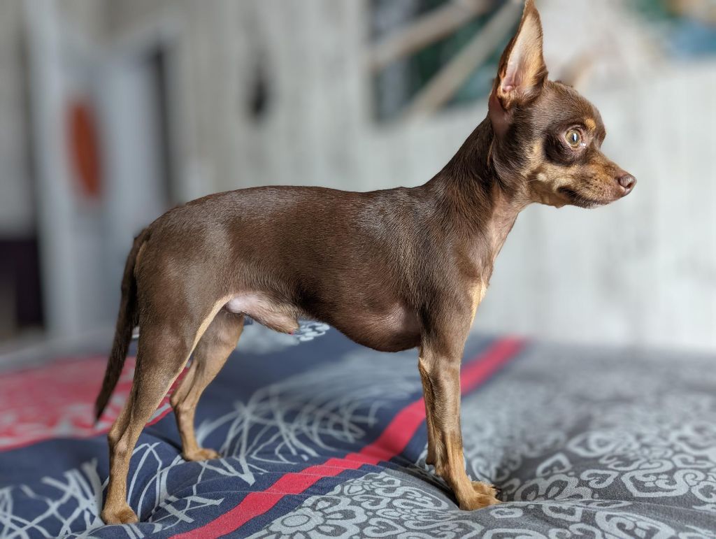 Sacha des Dunes de Keremma magnifique Russkiy toy chocolat et fauve confirmé LOF est disponible pour saillie à Vannes(Morbihan). Sacha est un chien doux, joueur et bien équilibré. Il a été classé 1er excellent, meilleur jeune et meilleur de race à sa première exposition le 28 aout 2022 à Segré.