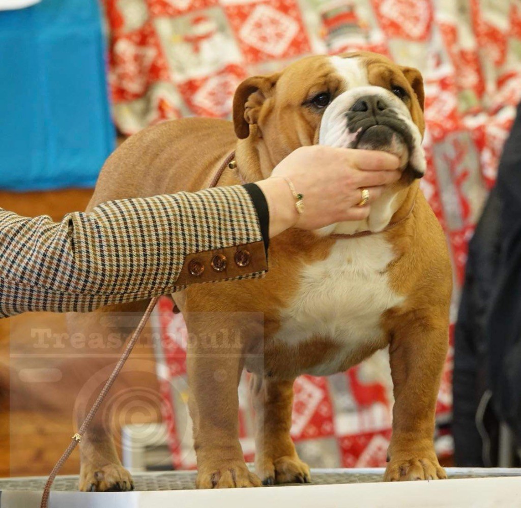 JB (8,2a)1. Cagniart, Myally Bulldog The Killer QueenRed & White 11months, good sized head with rose shaped ears, dark clear eyes, dark muzzle, good upsweep, good pigment, tacked on shoulders, big in rib with good length, tail ok, moved OK. Awarded BPB.