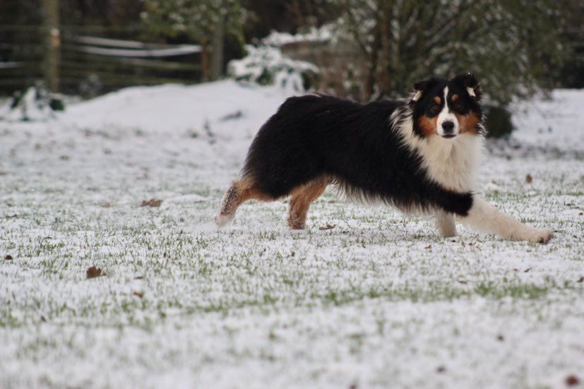 16 mois, DCC, en mue, d'une belle silhouetteExpression féminineBelle encolure, croupe et ligne de dosBelle avant main et jarret bien ressortiBelle largeur de cuisse, encore juvénile mais promise à un bel avenirBelle tricolore éléganteExcellent aller-retour et profil, allures efficaces