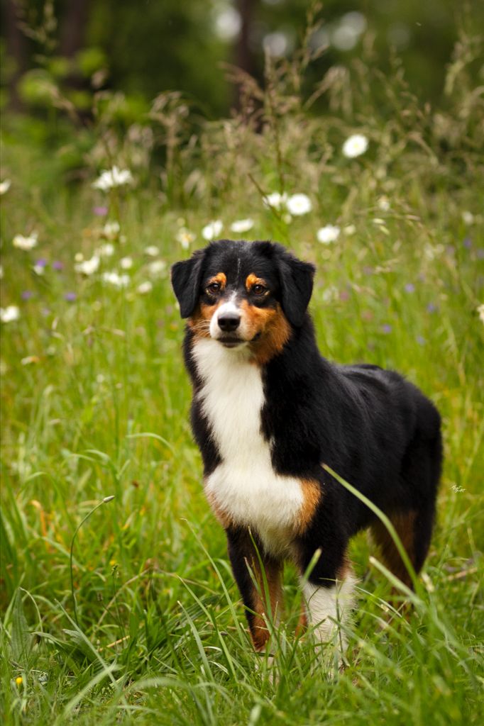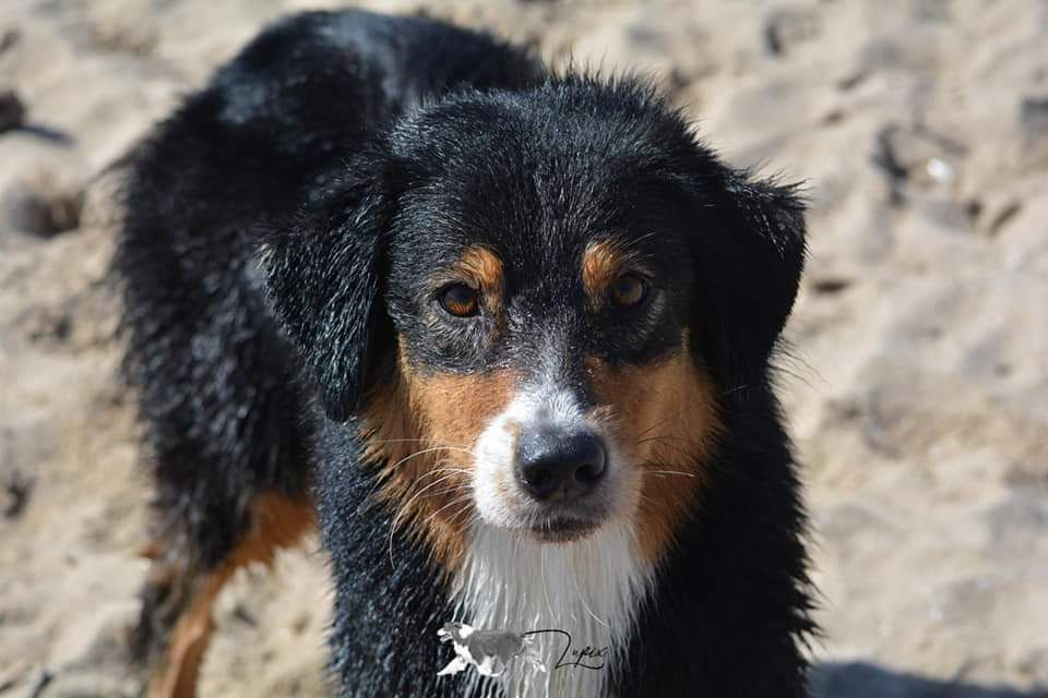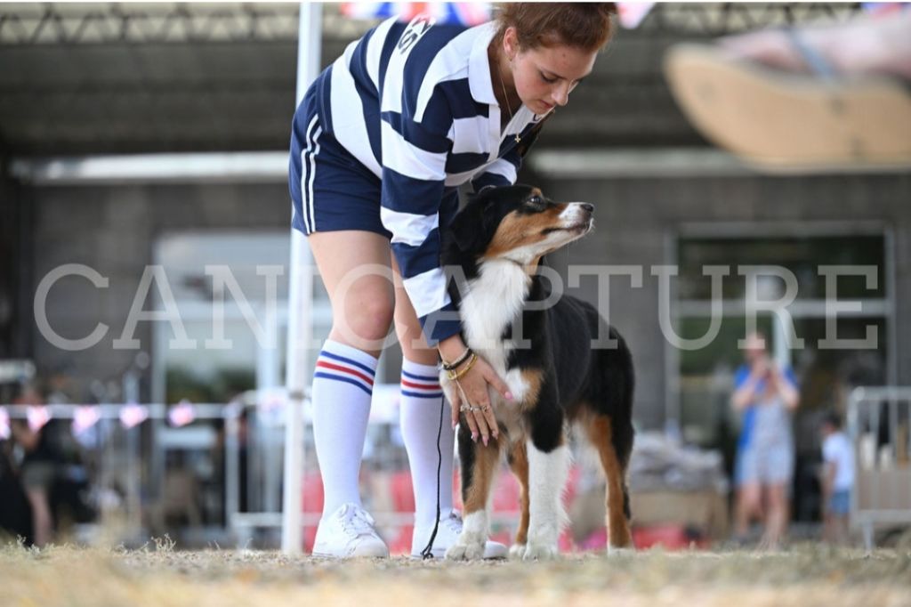 Dans le type, féminine, DCC, Exc proportions, Exc // , stop bien défini, Exc forme des yeux et port d'oreilles. Exc pigmentation, belle encolure, dos droit et ferme, Exc croupe, TB angulations AV, Exc angulations AR, Exc poitrine ossature pieds et aplombs. TB robe, Exc mouvement et caractère