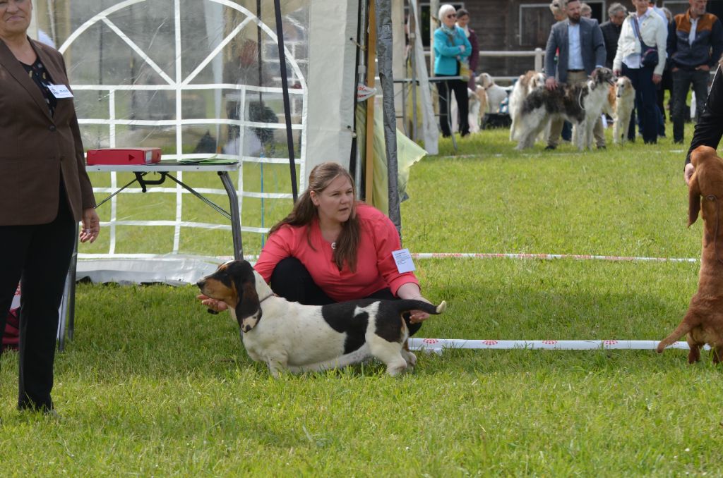 chienne assez longue avec tete féminine , proportion correcte longues oreilles long cou ligne dorsale pourrait etre + ferme cotes correctes poitrine bien marquéeangulation correcte ouvre un peu les pieds a l'avant bon mouvement