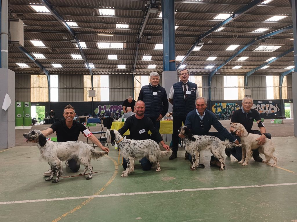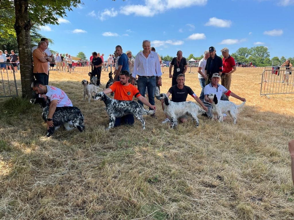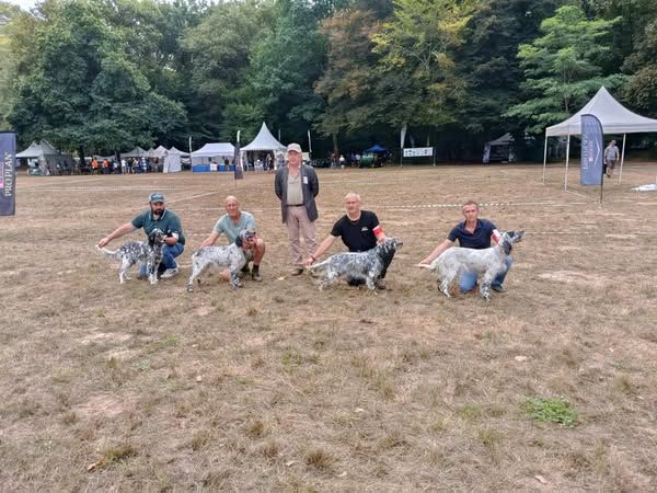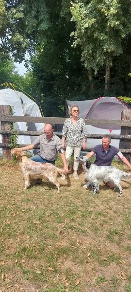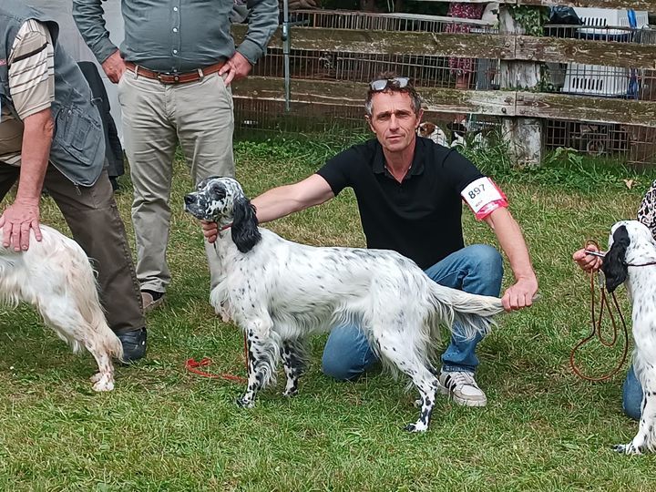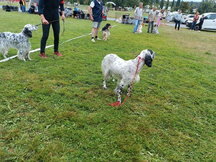 Taille 56 cmJolie femelle setter, joli modèle dans un rectangleExc. tête, sortie d'encolure, morphologie, angulations.Démarche souple