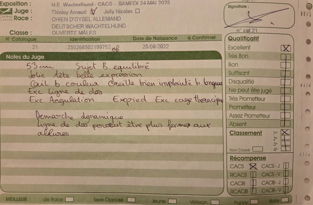 1er Excellent CACIBAnw. Dt. Ch. VDH CAC BOB Ortenau - Sieger AlpensiegerCommentaires : "Mâle de 18 mois, tête typique VH bien positionné et guidhaut et bas parfait. souligné, mouvement fluide, comportement agréable"