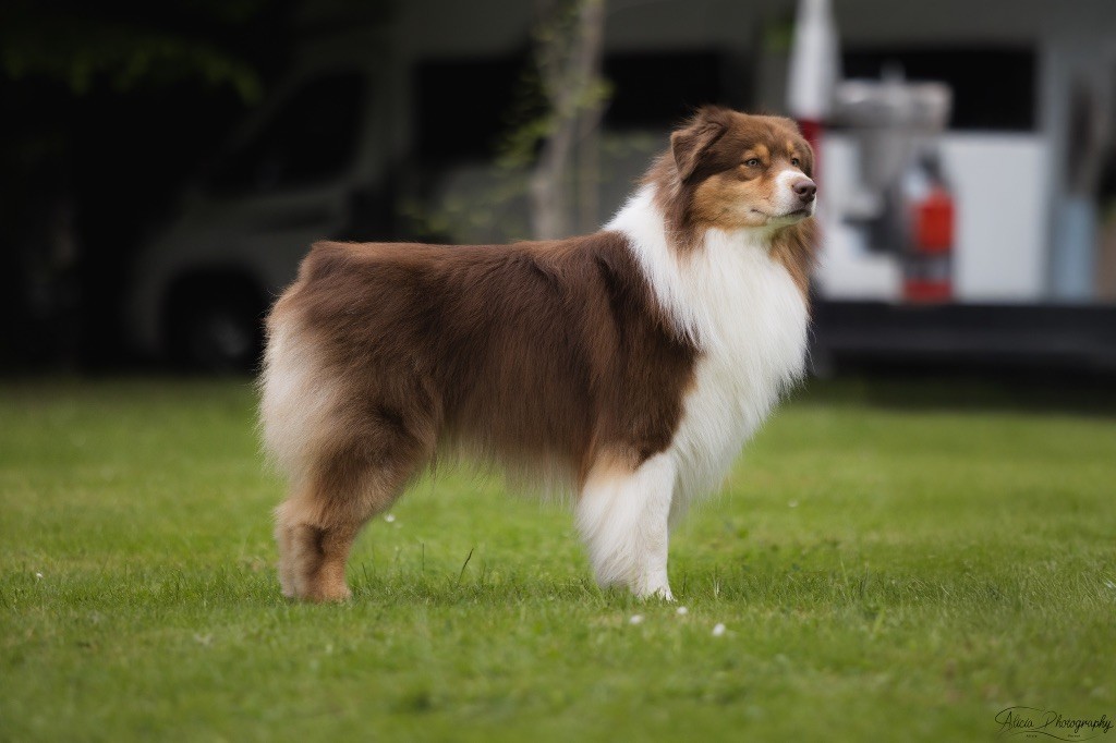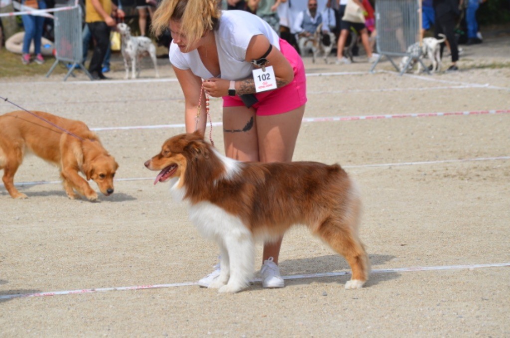DCC, Jolie male de taille moyenne, Construction equilibree, male sans lourdeur et sans feminitee, Poitrine bien descendue et ceintree, Poitrail correct, Angulation moyenne, Ossature moyenne, Dos tendue, Croupe bien incline, Jolie tete seche et cisele, Excellent stop crane et parallelisme, Excellent yeux bien places, Excellent oreilles bien placees, Excellent mouvement