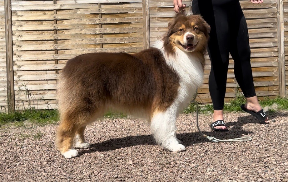 DCC, Excellent format et osssature, Tete bien masculine et bien dessinee, Excellente expression, Excellente encolure ligne de dos et croupe, Belle poitrine, Tres bonne angulations avant et arriere, Excellent aplombs, Excellente convergence avant arriere, Excellent mouvement de profil