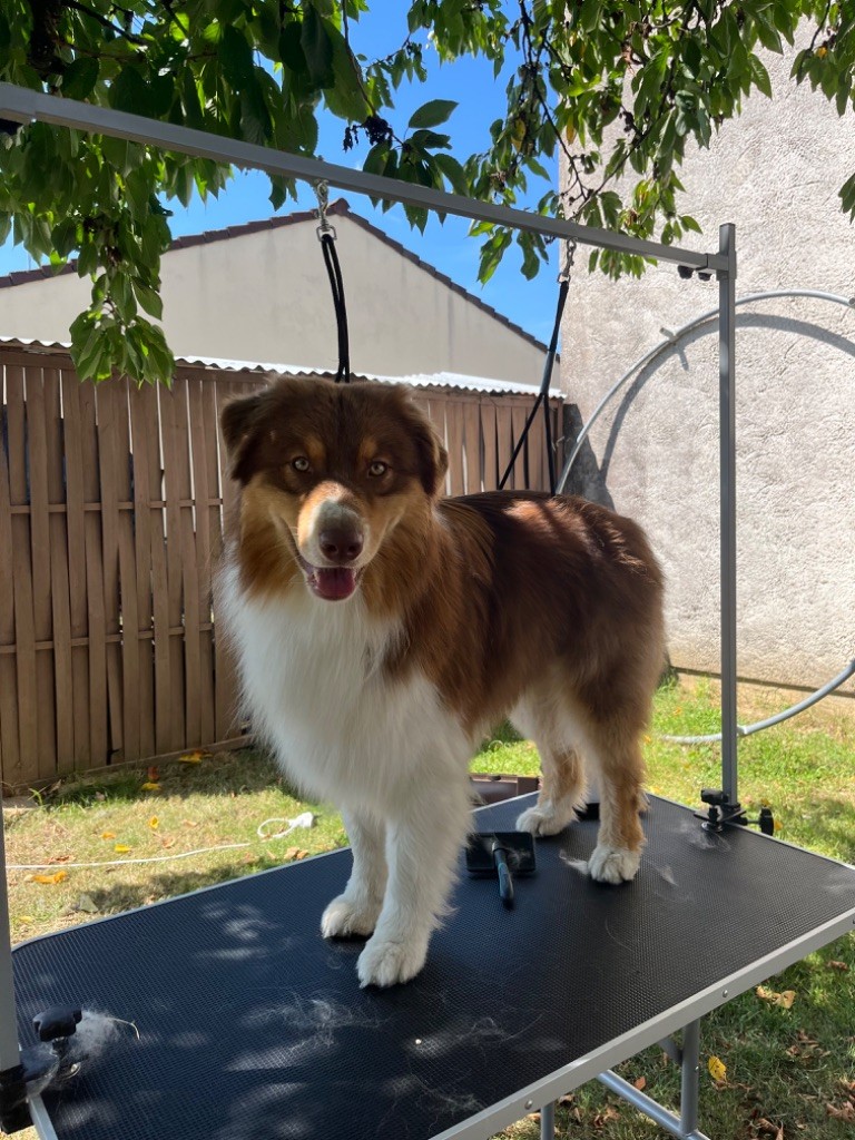 Très bonne tête dans son ensemble, bonne expression, un peu réticent à montrer les dents, Très bonne construction, très bonne sortie d?encolure, excellent dessous, excellent aplombs, excellente ossature, très bon caractère, marche bien