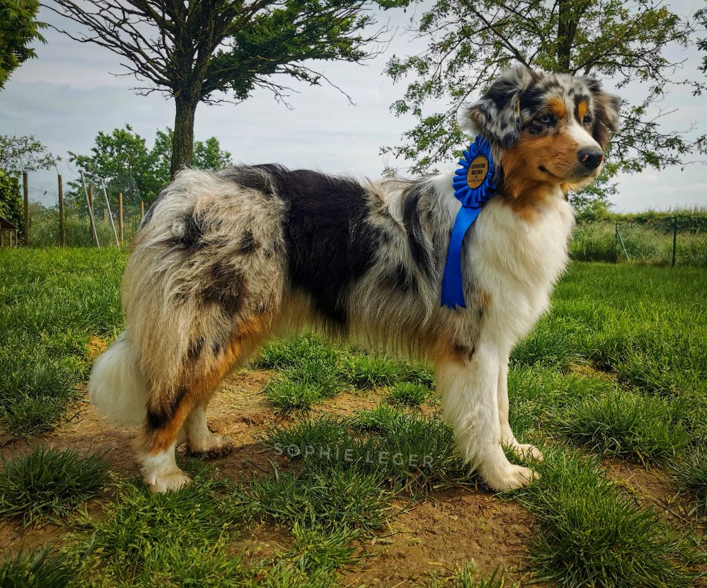 DCC complete - Bleu merleTaille moyenne, excellente textureBonne proportion de corps, angulation moyenne, excellente ossature.Bonne poitrine pour l'âge, encolure correcte, tête féminine.Manque un peu de volume de museau, excellents yeux, oreilles moyennes, correctement portées.Manque de prise de terrain à l'avant, fouet un peu gai