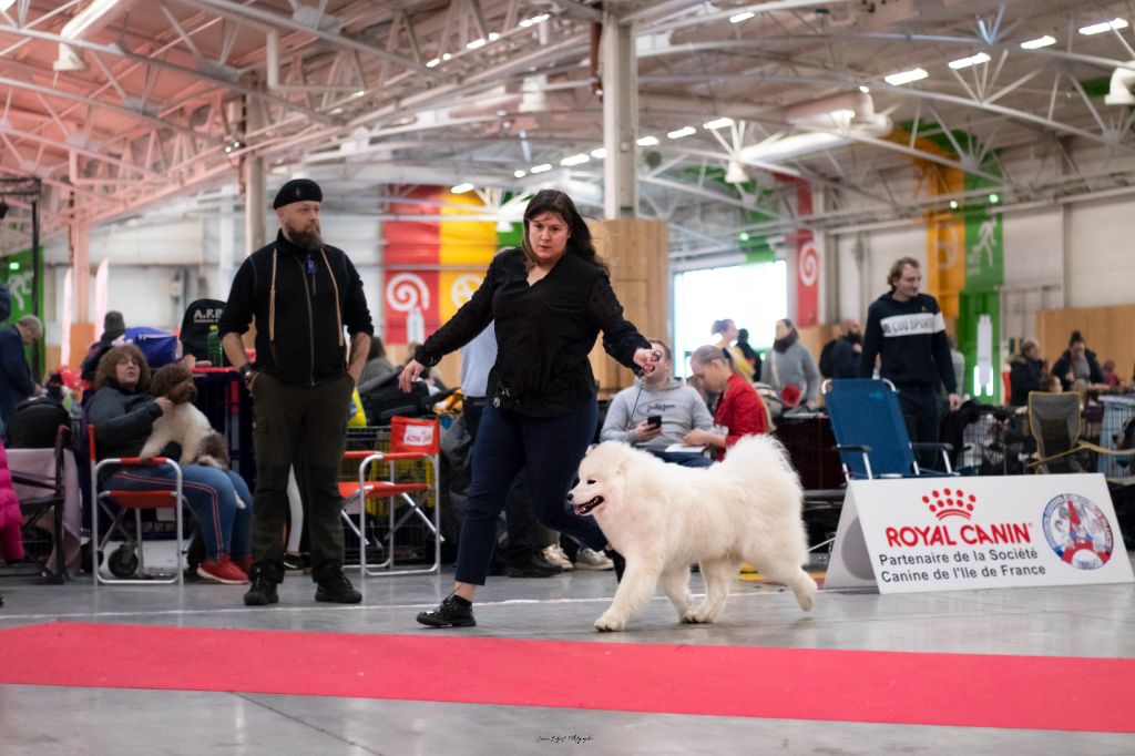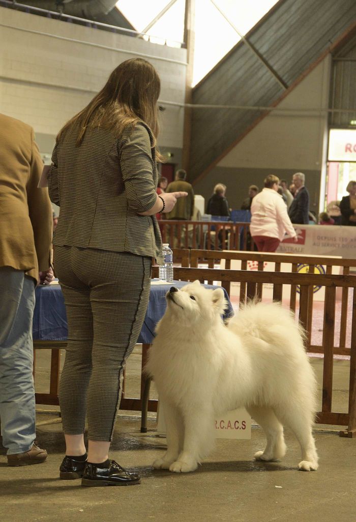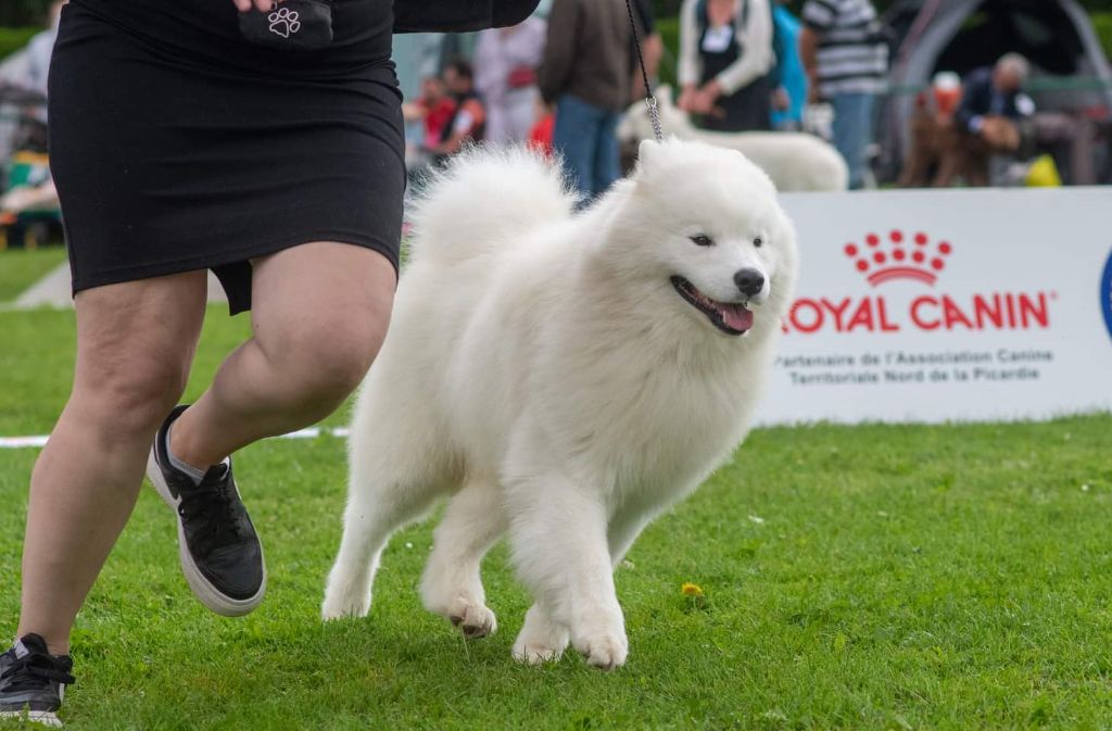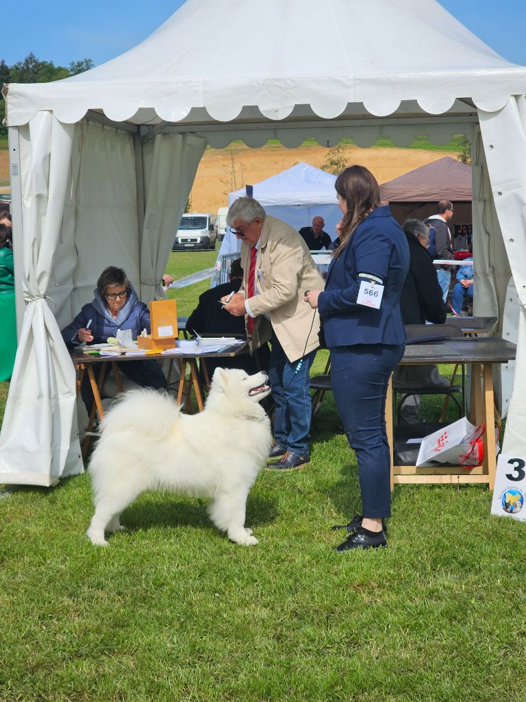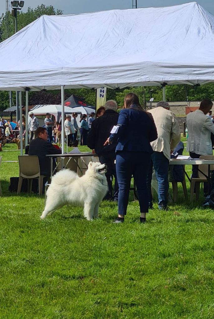 Excellent sujet, excellente proposition, excellentes oreilles, excellent yeux, excellente pigmentation, excellente denture, excellentes épaules et avant mains, très bon pieds, excellente poitrine et ligne de dos, excellente posture, excellent port de fouet, excellente qualité de fourure, ouvre un peu des postérieurs à la marche.