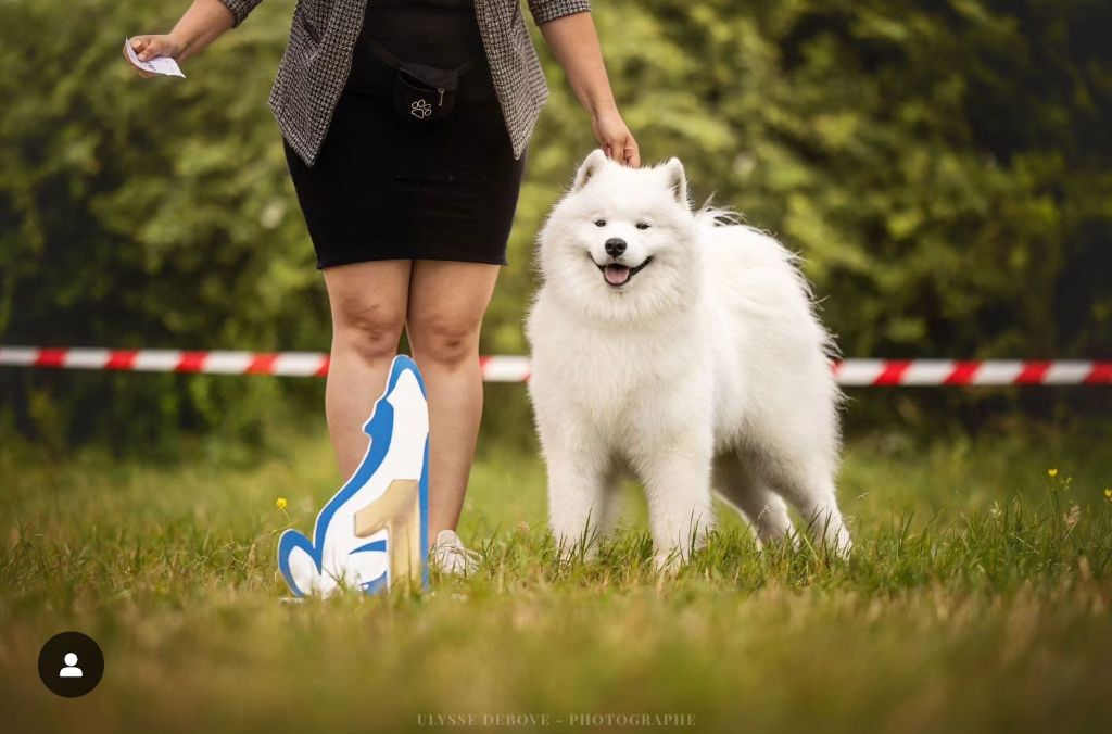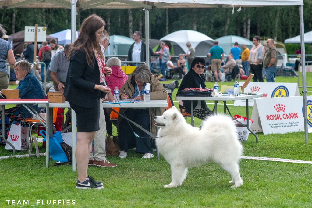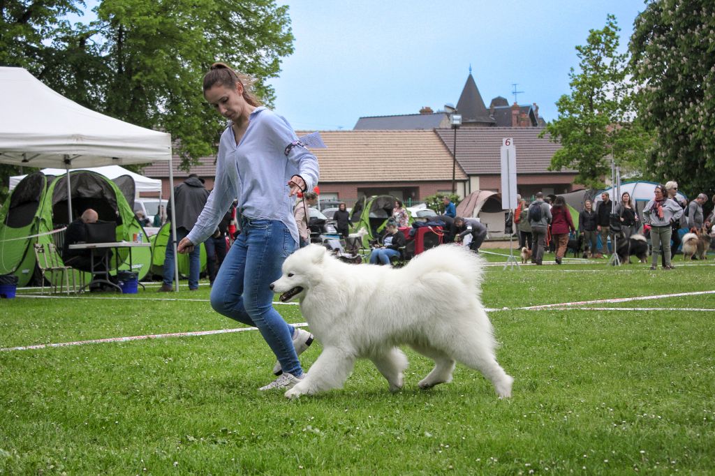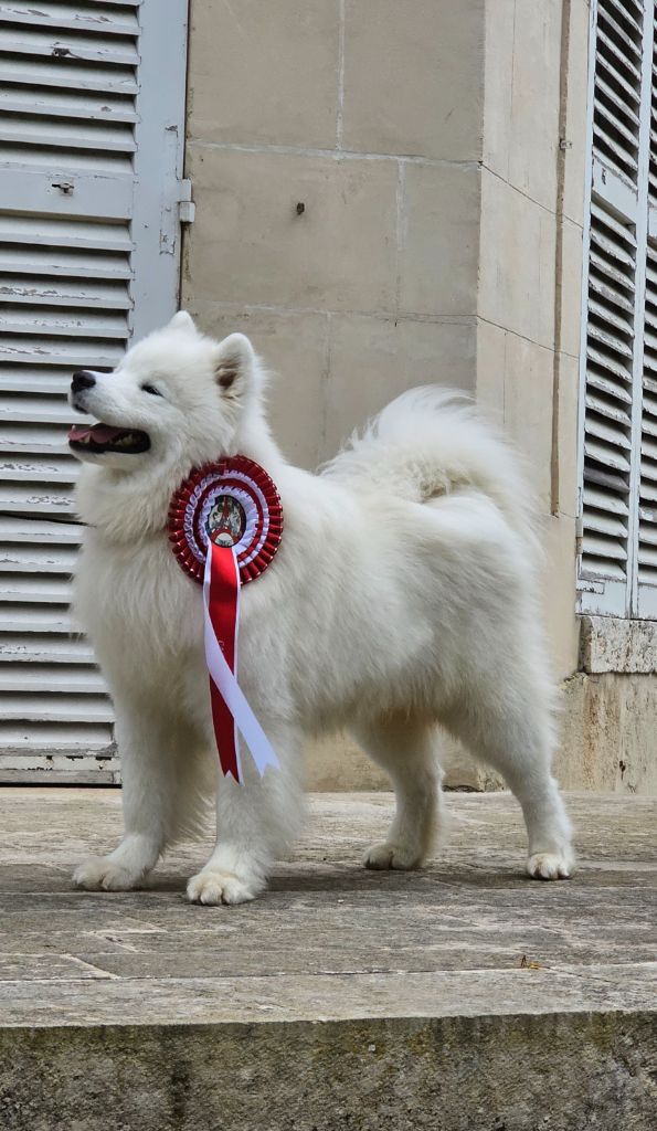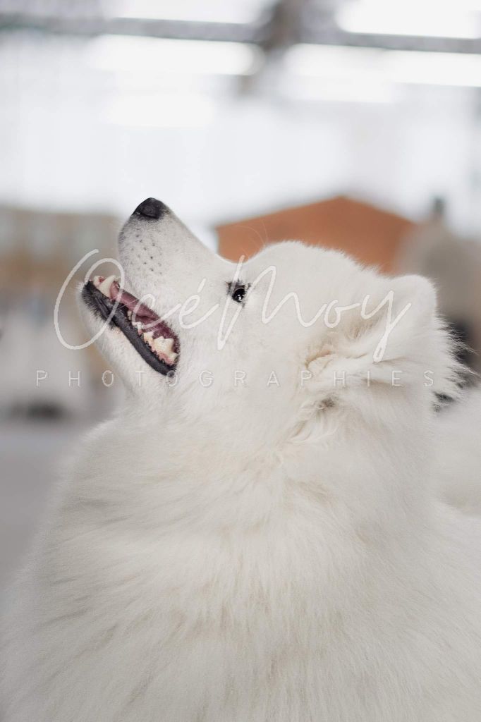 Excellent sujet, excellente proposition, excellentes oreilles, excellent yeux, excellente pigmentation, excellente denture, excellentes épaules et avant mains, très bon pieds, excellente poitrine et ligne de dos, excellente posture, excellent port de fouet, excellente qualité de fourure, ouvre un peu des postérieurs à la marche.
