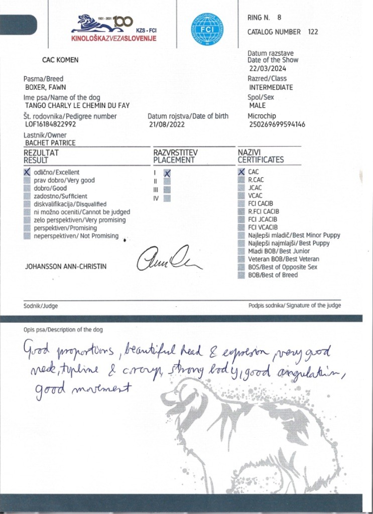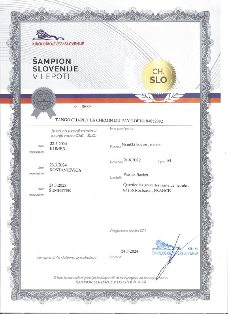 - 1er excellent CAC RCACIB Champion de Slovénie