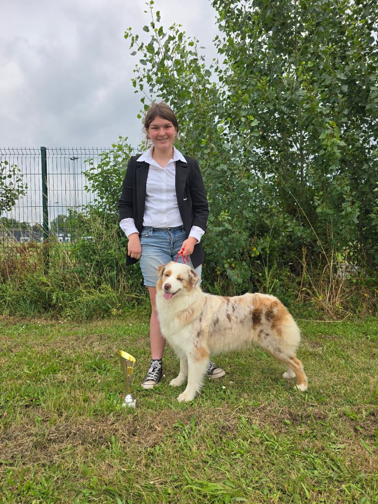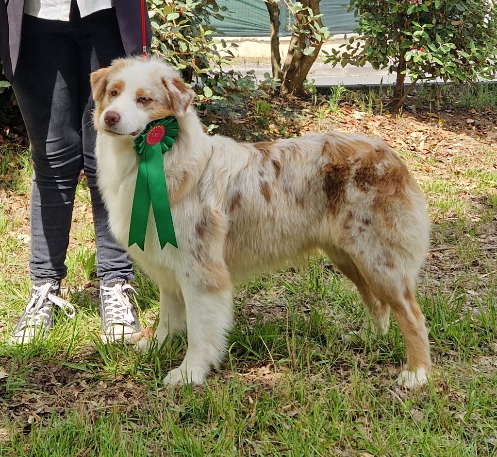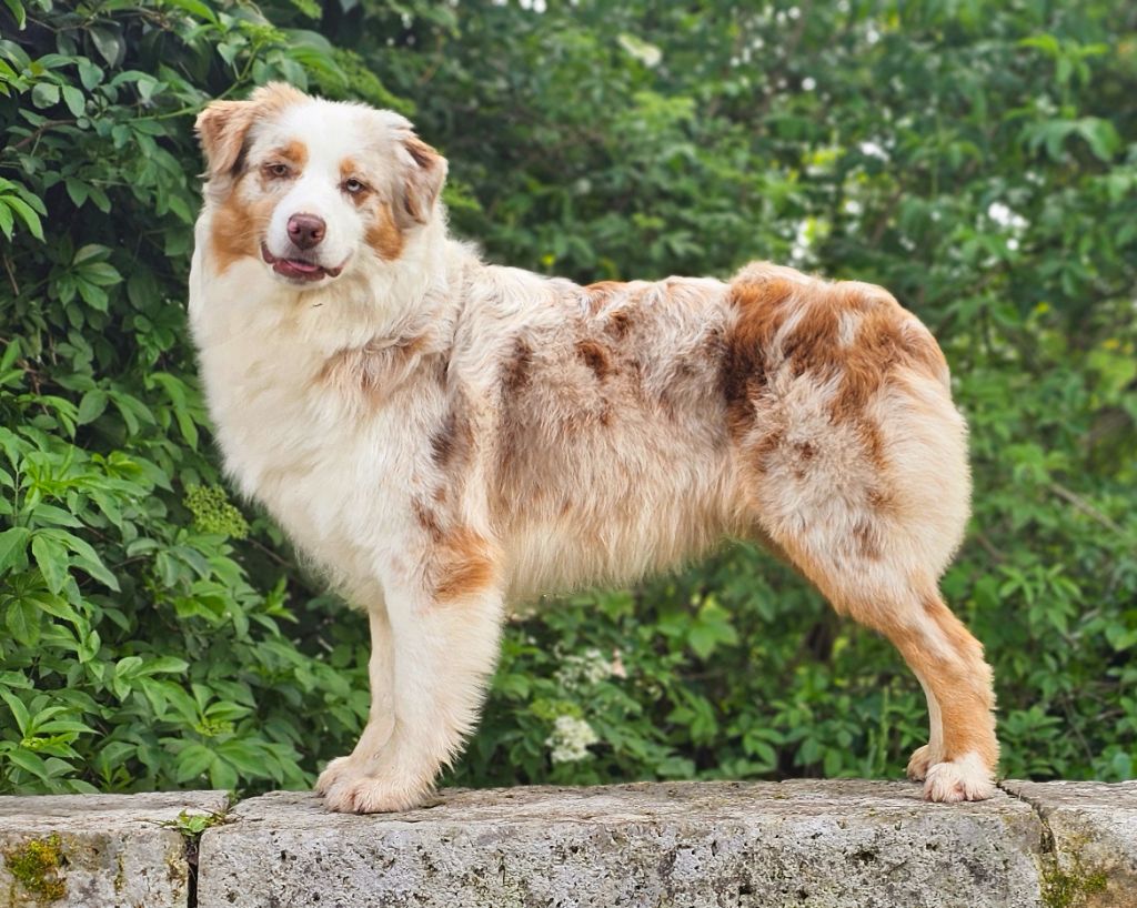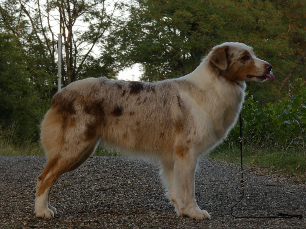 DCC. Bonne taille, Rouge merle un peu dilué.Excellente corpulence,Bonne proportions. Belle avant main-Encolure Bien enserrée- arrière correcte tête bien proportionnée, 1 peu chargée en blancExcellent crâne, stop et museau, exc yeux, oreilles bien portées.Bon mouvement. Mais le dos roule et ne tient pas