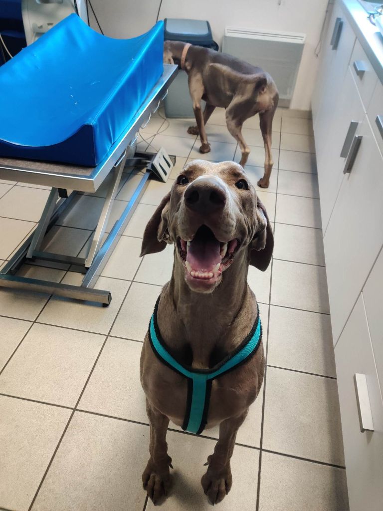 Jewell est magnifique. Puissant et dynamique il en impose malgré son jeune âge. Il est super pot de colle et très gourmand. un amour de weimar.