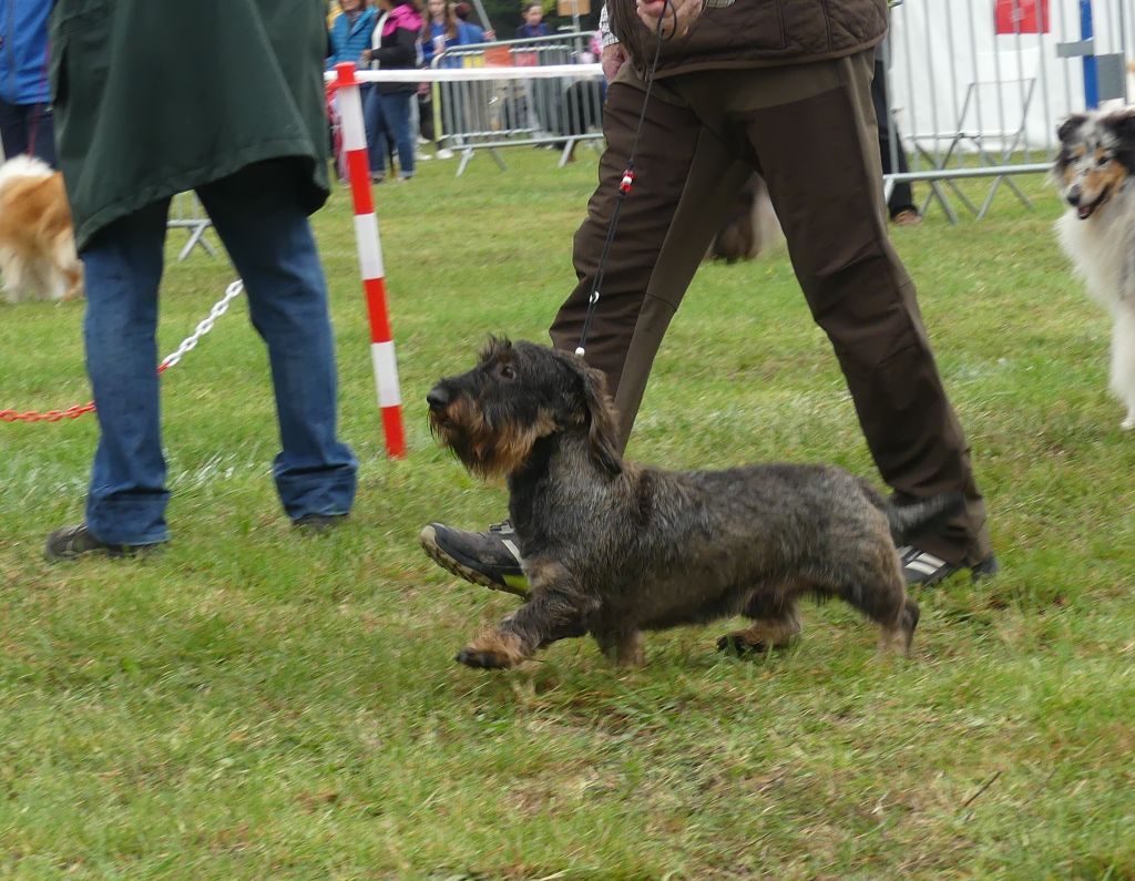 Déjà très bien établi - Belle tête masculine avec barbe - Excellente ligne de dos - la poitrine doit encore descendre - Excellente qualité de poil - Marche bien avec très bonne prise de terrain.