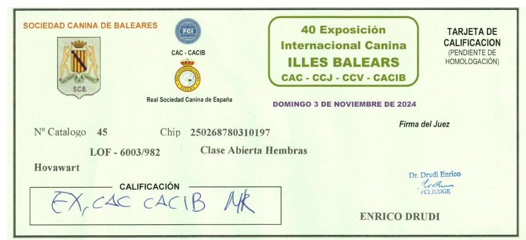 03/11/2024: exposition internationale de Palma, Majorques (Espagne): Excellent 1, CAC, CACIB, BOB, juge Enrico Drudi (Esp)