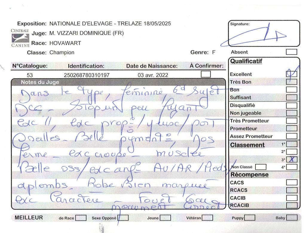 18/05/2025: Nationale d'Elevage à Trélazé: Excellent 3, en classe champion, juge Dominique Vizzari