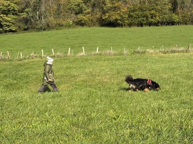12 mois, grande chienne, puissance moyenne.Tête puiss.yeux foncés, angulations correctes;DCC;Tbelle robe noire profond,feux blonds moy, pannachés aux jambes;Mvt Av decollé, Ar serré, mvt en cercle fortement fluide;queue très enroulée;très amicale et présente