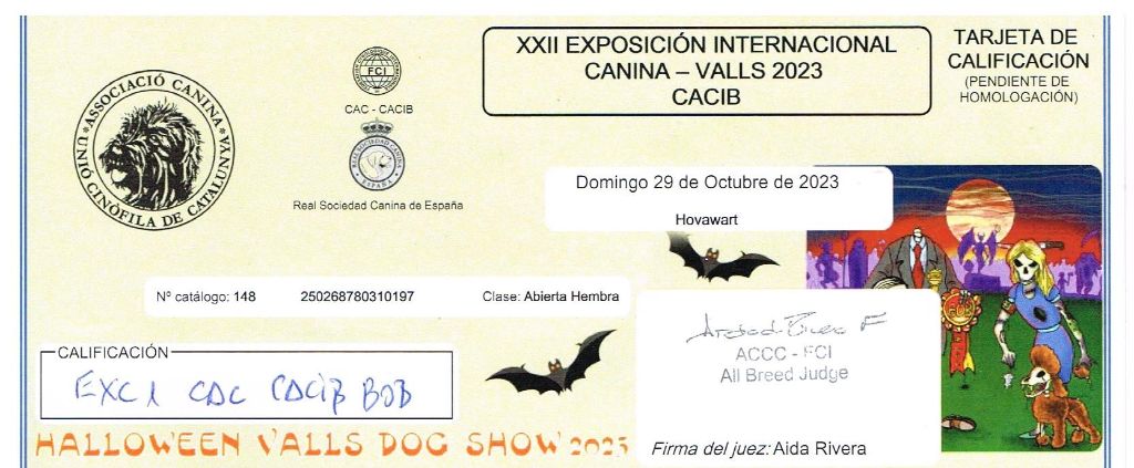 29/10/2023: Valls (Espagne), exposition internationale, classe ouverte: Exc1, CAC, CACIB, Meilleur de Race, juge Aida Rivera