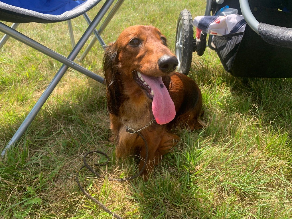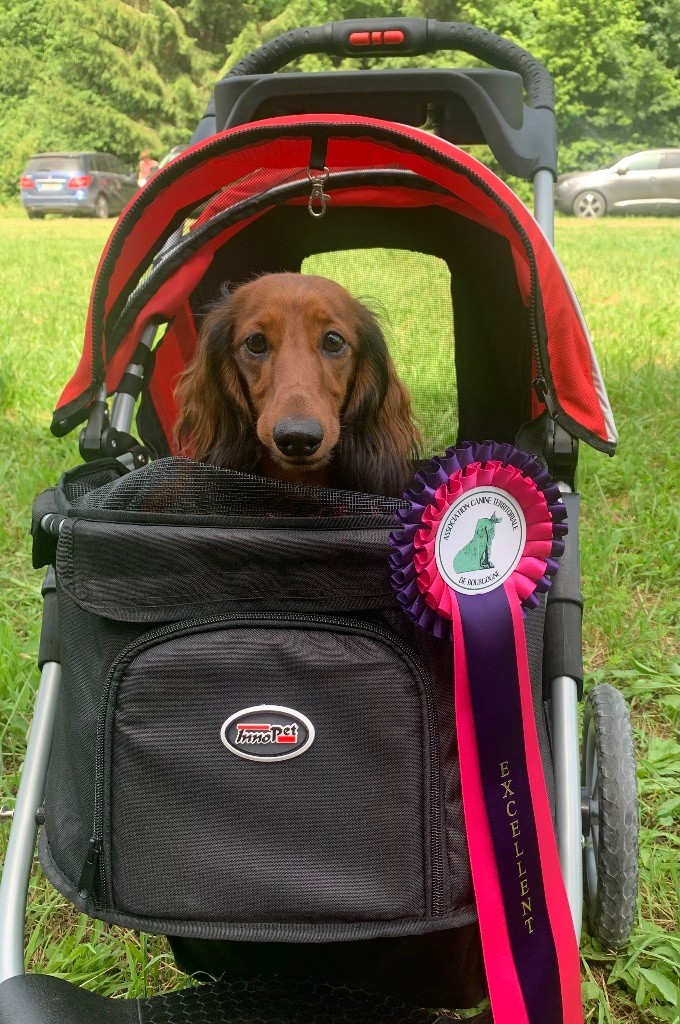 Stérilisée en septembre 2024 suite à un problème gynécologique avant même d'avoir eu une portée, elle est très protectrice avec les jeunes teckels de la maison.