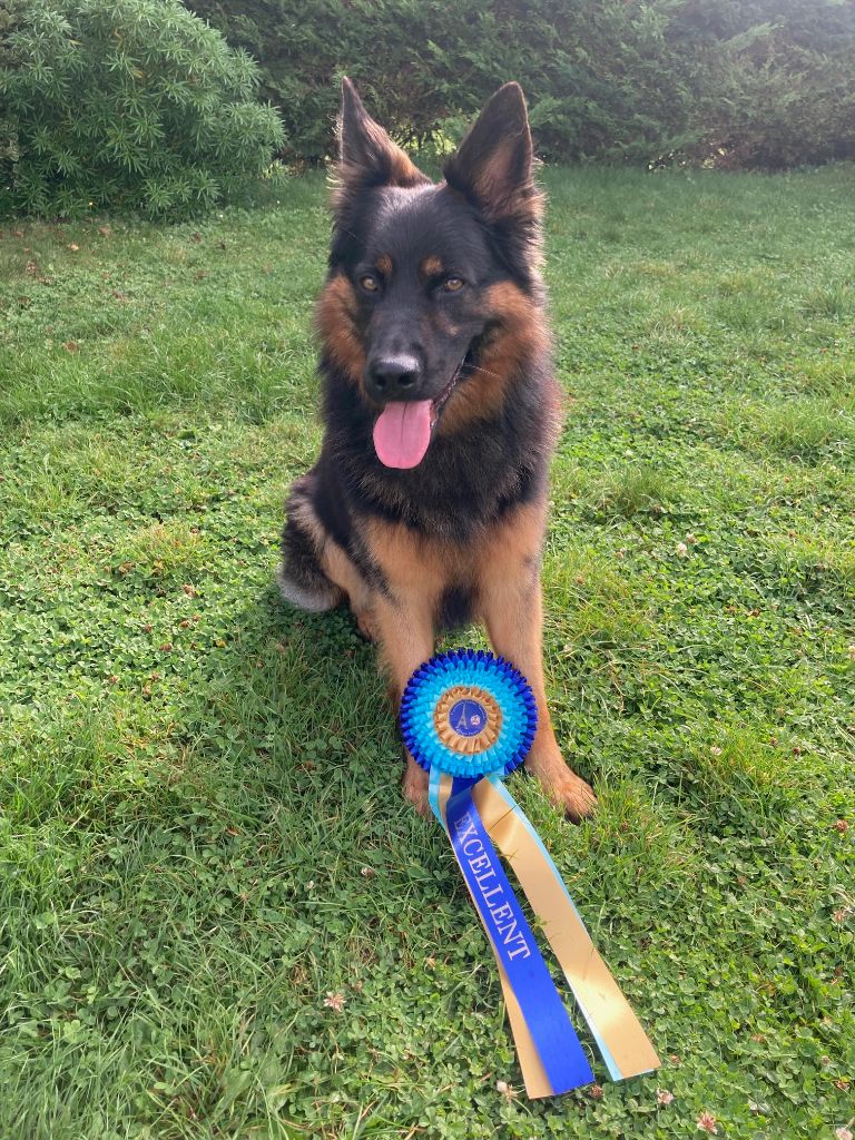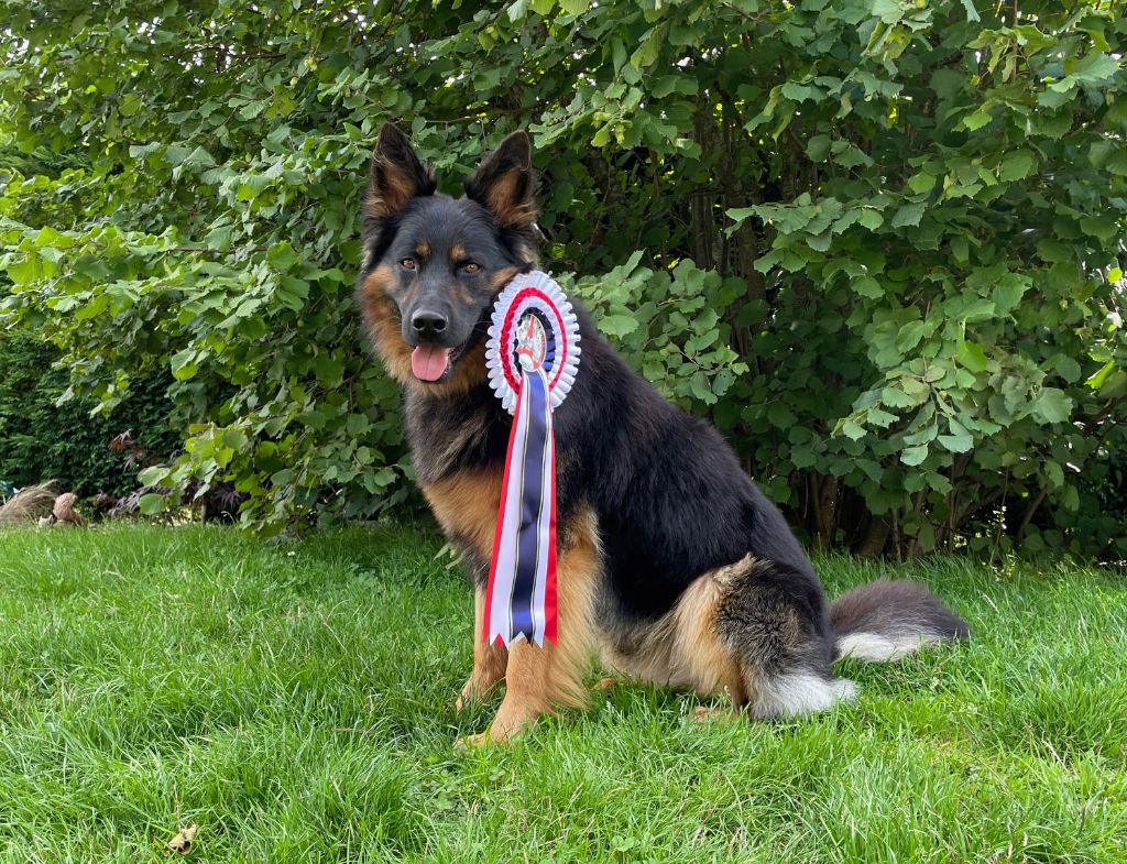 Sujet masculin. Tête bien proportionnée, Bon // oreilles B attachées. Exc encol. Belle ossat. Dos B long et B tendu.Exc forme poit. B AR main et cuisses. Joli mouvement et fouet Exc feux.