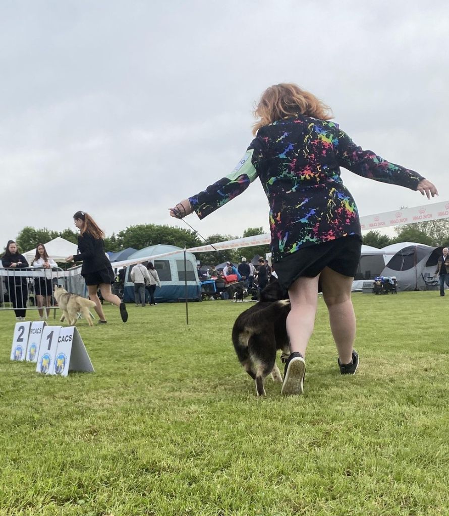 Très joli sujet.Excellente tête.Oreilles bien portées.Excellents yeux, pigmentation et denture.Epaules avant main et pieds.Poitrine et ligne de dos.Excellent port et attache de queue.Très bonne démarche