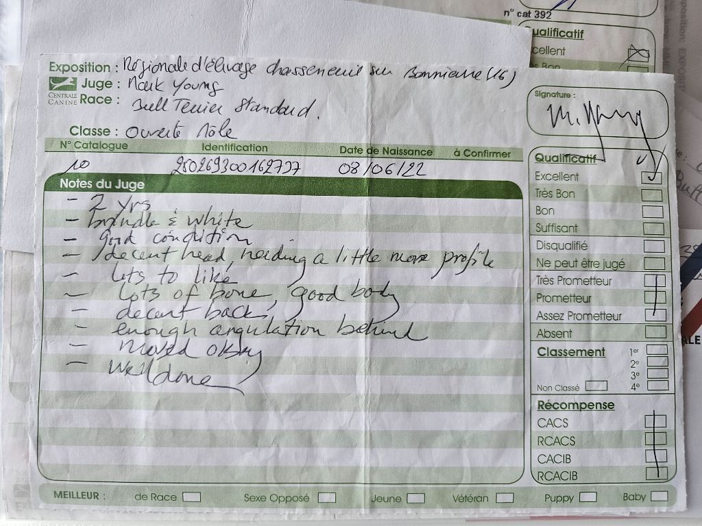 Âgé de 16 mois, mâle typique de belle race, oreilles bien placées et portées, petit oeil foncé, excellente expression, belle tête ovoïde, articulé en ciseaux très serrés, beau cou et ligne du dessus, excellent jeu de queue et port, excellent poitrail, pattes droites, beau arc costal.excellentes angulations, mouvements puissants et quelque peu lâches, excellent poil et tempérament.