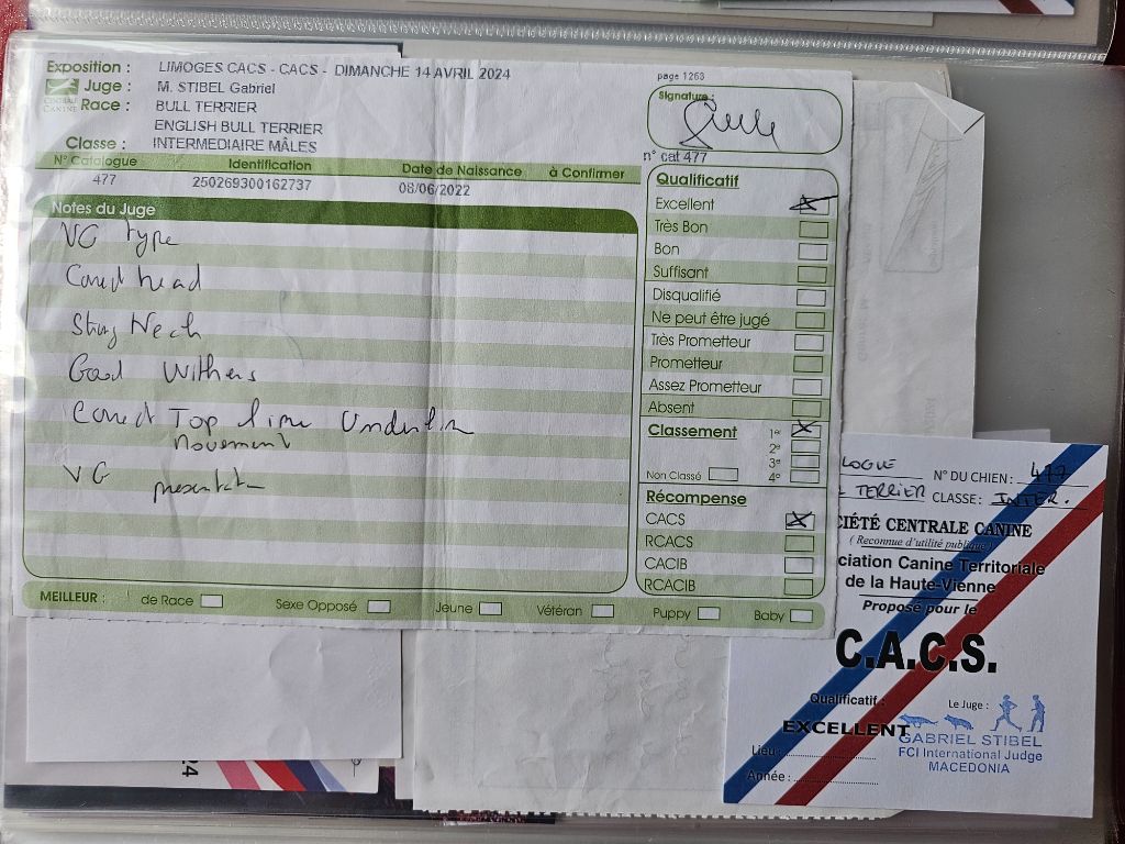 DCC.Joli sujet.Très belle tête. Bon rapport crâne cha?frein. EXC oeil oreille. EXC dos épaule poitrine. EXC ant et AR main. EXC mvt. B fouet.Chien puissant.