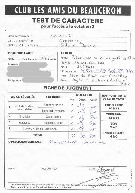 Commentaire du juge :"Chienne très stable" - Mention Excellent
