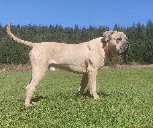 De beau gabarit (52 kilos), Simba a un super caractère. S'entend avec mâles, femelles et les chiots de l'élevage. Bien en os, jolie tête, regard expressif, joli déplacement, belle ligne de dos.