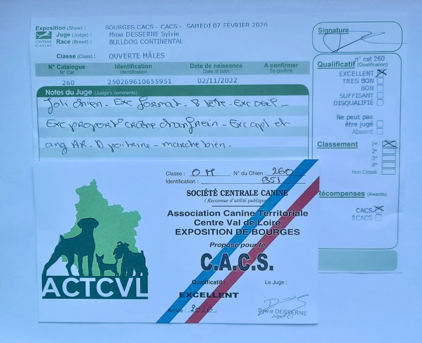 - 4ème excellent Nationale d'Elevage Créhen Septembre 2025 - 1er excellent + CACS + meilleur de sexe opposé exposition nationale Chatel Guyon Août 2025 - 1er excellent CACS + meilleur de sexe opposé Cressat Juillet 2025 - 3eme excellent Championnat de France Dijon Juin 2025 - 1er excellent CACS + meilleur de sexe opposé exposition nationale Vallères Mai 2025 - 1er excellent CACS exposition nationale Chalon sur Saône Mai 2025 - 1er excellent CACS + meilleur de race Spéciale de Race Limoges Avril 2025 - 1er excellent RCACS exposition nationale Montluçon Mars 2025 - 1er excellent CACS + meilleur de race Spéciale de Race Bourges Février 2025 - 1er excellent Nationale Elevage Septembre 2024 - 2ème excellent RCACS Championnat de France Montluçon Juin 2024 - 1er excellent CACS + meilleur de race Spéciale de race Montluçon Juin 2024 - 1er excellent + meilleur de sexe opposé Régionale élevage Wasselonne Avril 2024 - Très bon Nationale élevage Bourbon Lancy Septembre 2023 - 2ème très prometteur Régionale élevage Montoulieu Avril 2023 - 1er très prometteur + meilleur baby exposition nationale Alès Avril 2023 - 1er très prometteur + meilleur baby exposition nationale Alès Avril 2023