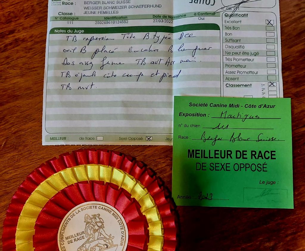 Elle a obtenu à seulement 13 mois, le titre de 1e excellente et Meilleure de Race en Sexe Opposé lors de l'exposition de Martigues (13) le 23/04/2023 organisée par la Société Canine Midi Côte d'Azur, ce qui fait que nous sommes d'autant plus fiers d'elle !