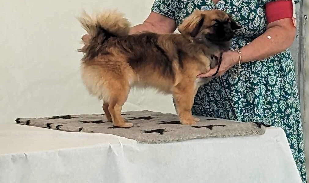 Jolie silhouette bien dans le rectangleJolie tête avec marque ?il de BouddhaExc tête + museau + mâchoire et dentureExc ossature + poitrine + très bonne arrière mainExc insert queue + fourrure pour son âge Exc mouvement, croisé à l?avant