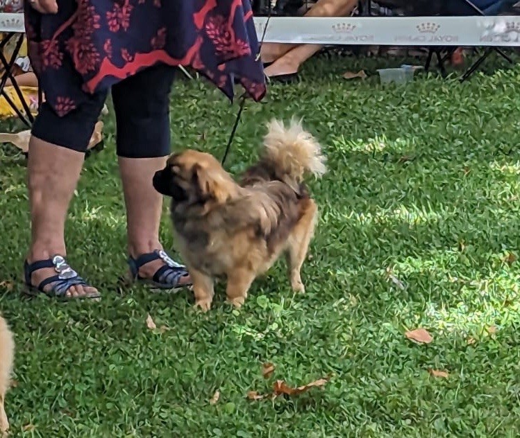 Très belle tête, menton présentDentition correctesLes yeux devraient être plus connexes, blanc visibleOreilles assez bien inséréeLes pieds devraient être plus en pied de liévreMembres antérieurs assez bien parallèles Poitrine à se finirQueue bien attachéeDémarche à travailler
